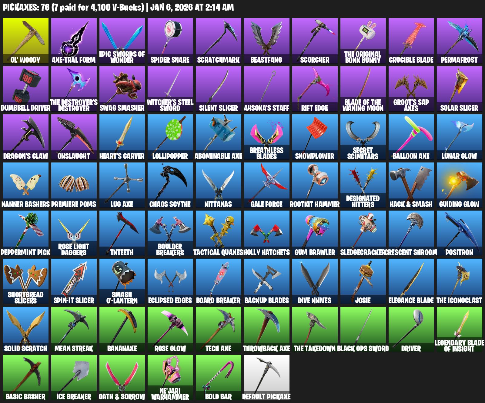 Ol’ Woody, Axe-tral Form, Spider Snare, Scratchmark, Beastfang, Scorcher, Crucible Blade, Permafrost, Dumbbell Driver, Swag Smasher, Witcher’s Steel Sword, Silent Slicer, Ahsoka’s Staff, Rift Edge, Groot’s Sap Axes