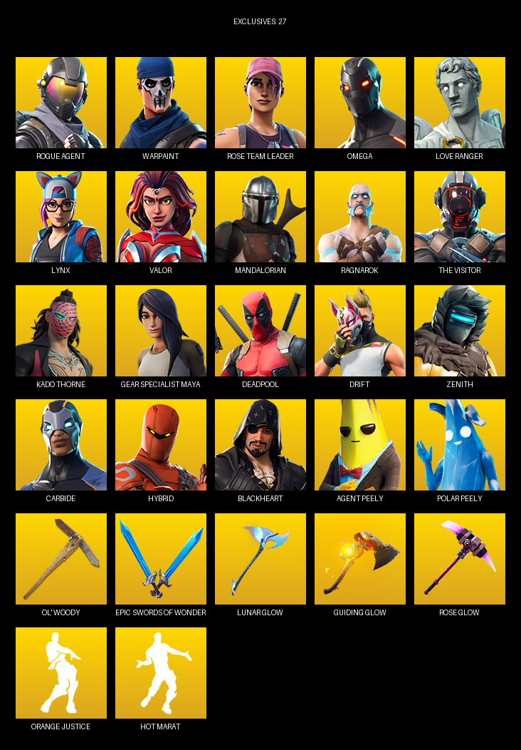 Omega, Gear Specialist Maya, Rogue Agent, Warpaint, Rose Team Leader, Love Ranger, Lynx, Valor, Mandalorian, Ragnarok, The Visitor, Kado Thorne, Deadpool, Drift, Zenith, Carbide, Hybrid, Blackheart, Huntress, Brutus