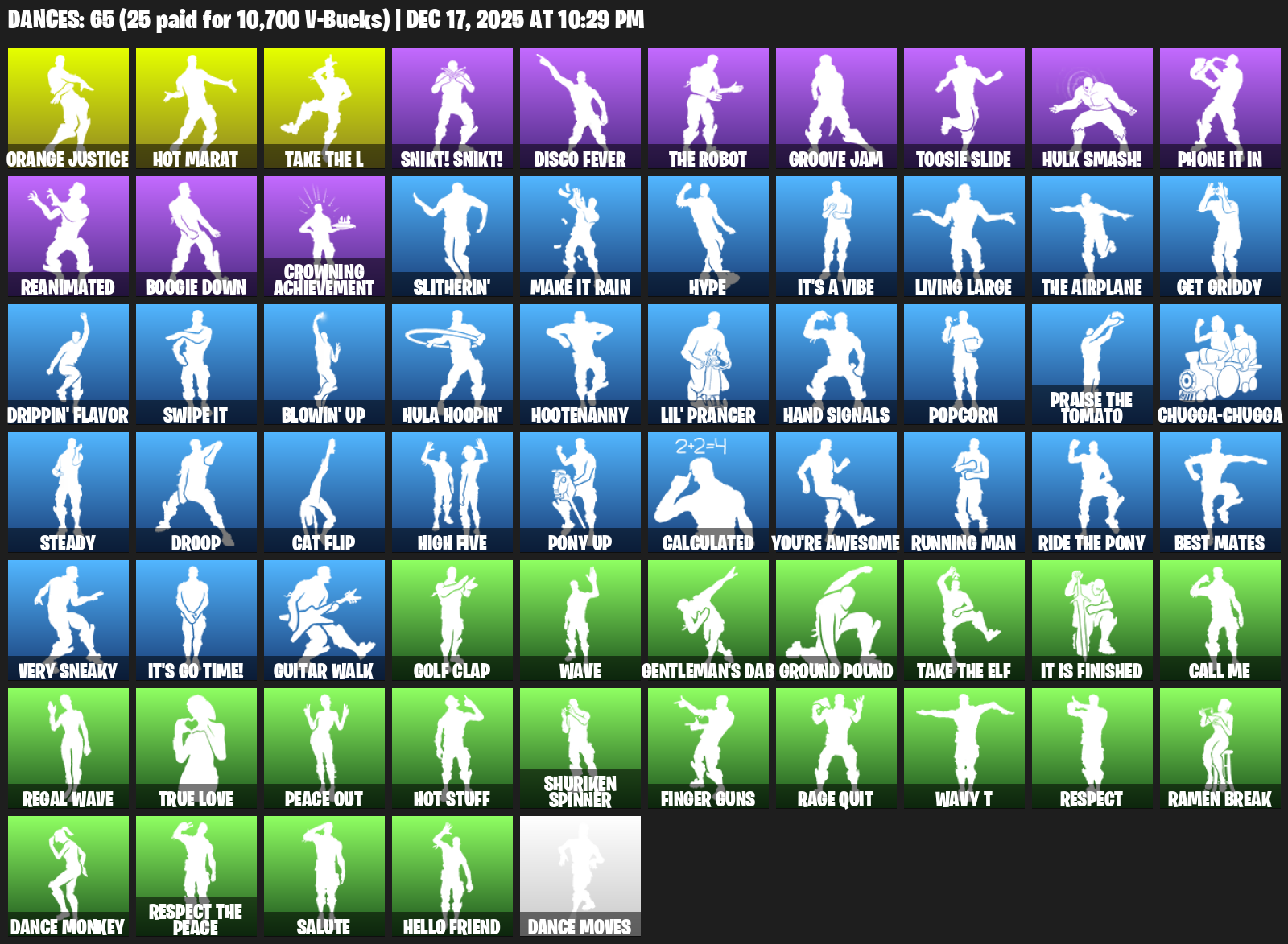 Hot Marat, Orange Justice, Snikt! Snikt!, Disco Fever, Groove Jam, Toosie Slide, HULK SMASH!, Phone It In, Reanimated, Boogie Down, Crowning Achievement, Slitherin’, Hype, It’s a Vibe, Living Large, Get Griddy