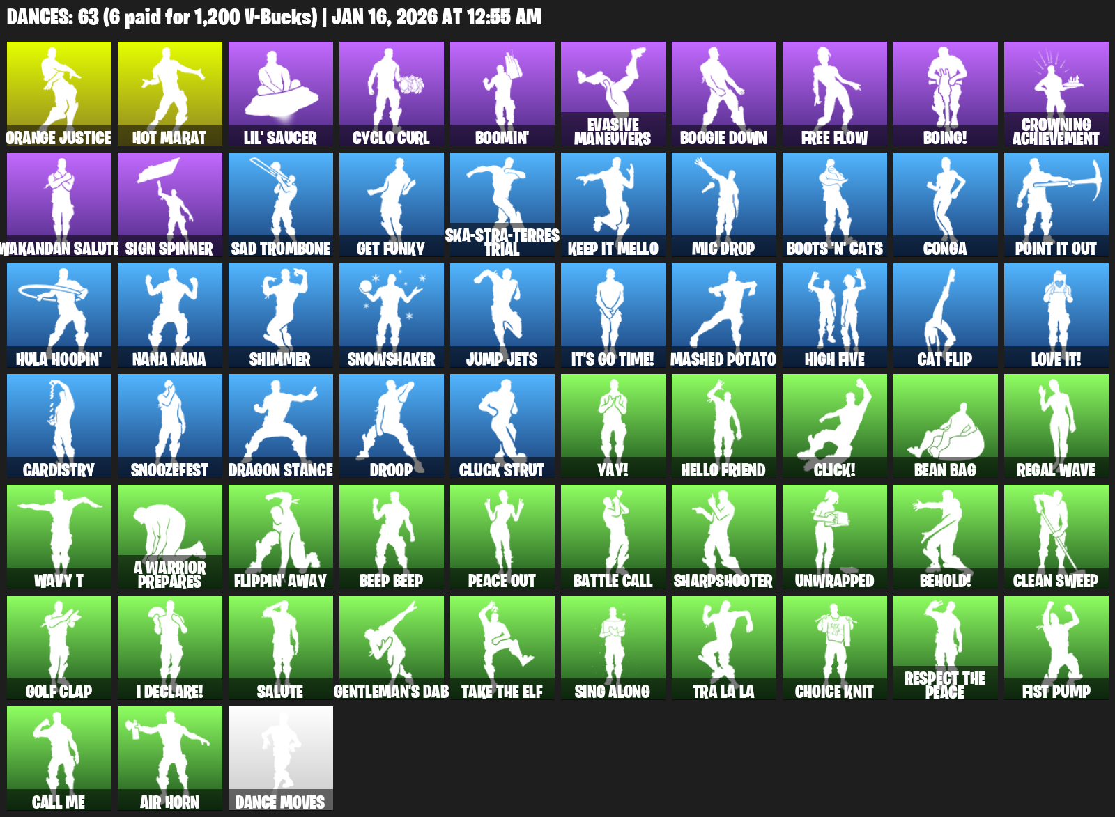 Hot Marat, Orange Justice, Lil’ Saucer, Cyclo Curl, Boomin’, Evasive Maneuvers, Boogie Down, Free Flow, Boing!, Crowning Achievement, Wakandan Salute, Sign Spinner, Sad Trombone, Get Funky, Ska-stra-terrestrial, Keep It Mello, Mic Drop, Boots ‘n’ Cats, Conga