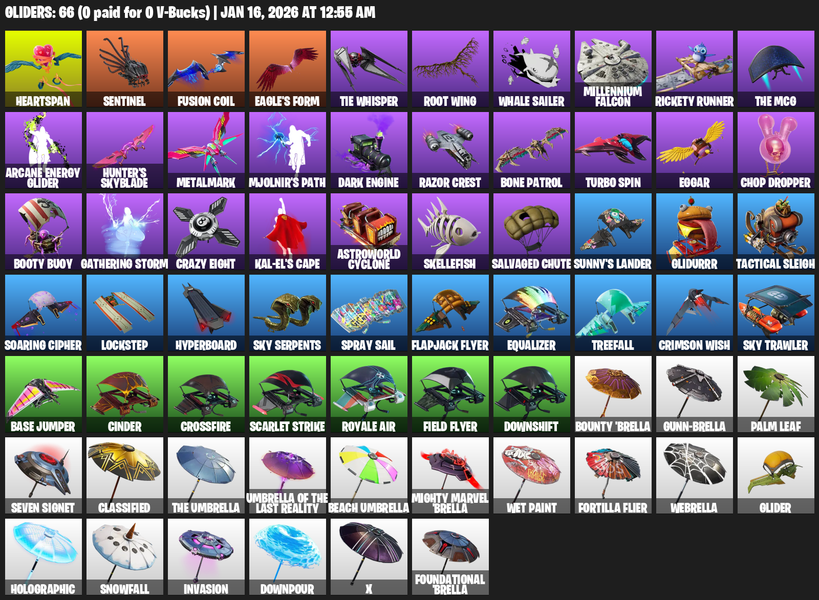 Heartspan, Eagle’s Form, TIE Whisper, Root Wing, Whale Sailer, Millennium Falcon, Rickety Runner, Arcane Energy Glider, Hunter’s Skyblade, Metalmark, Mjolnir’s Path, Dark Engine, Razor Crest, Bone Patrol, Turbo Spin, Eggar, Chop Dropper