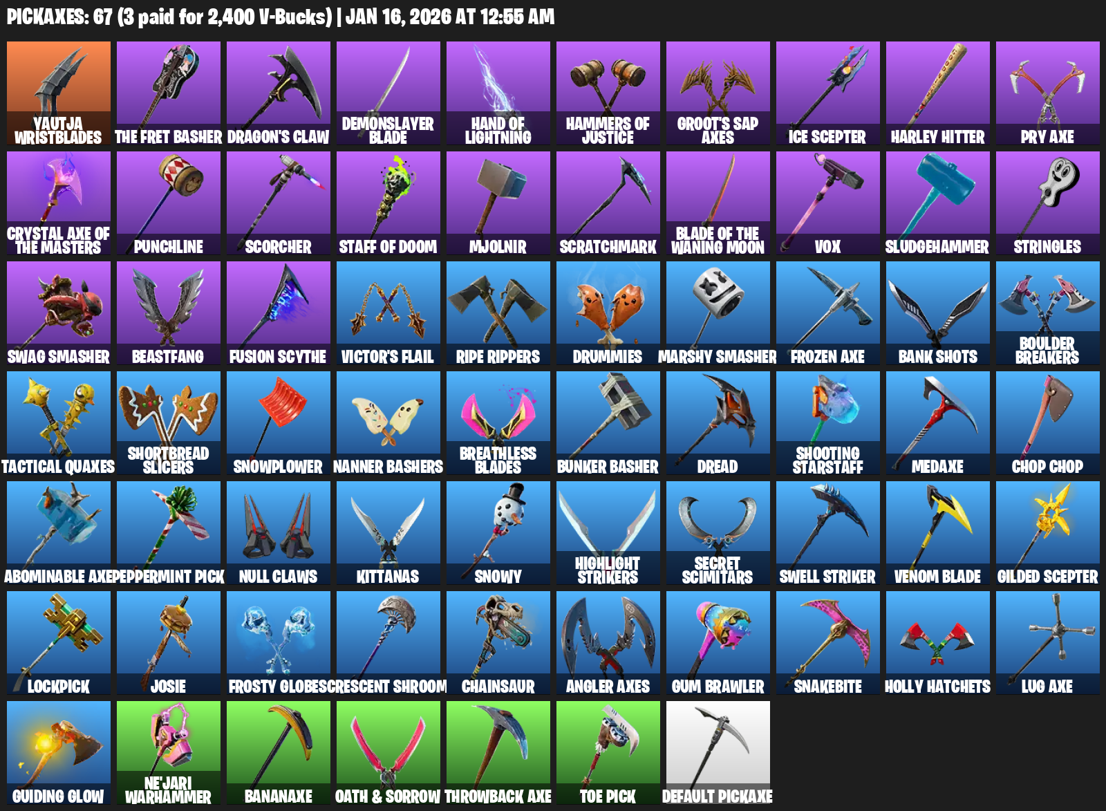 Yautja Wristblades, Dragon’s Claw, Demonslayer Blade, Hand of Lightning, Groot’s Sap Axes, Ice Scepter, Harley Hitter, Pry Axe, Punchline, Scorcher, Mjolnir, Scratchmark, Vox, Sludgehammer, Stringles
