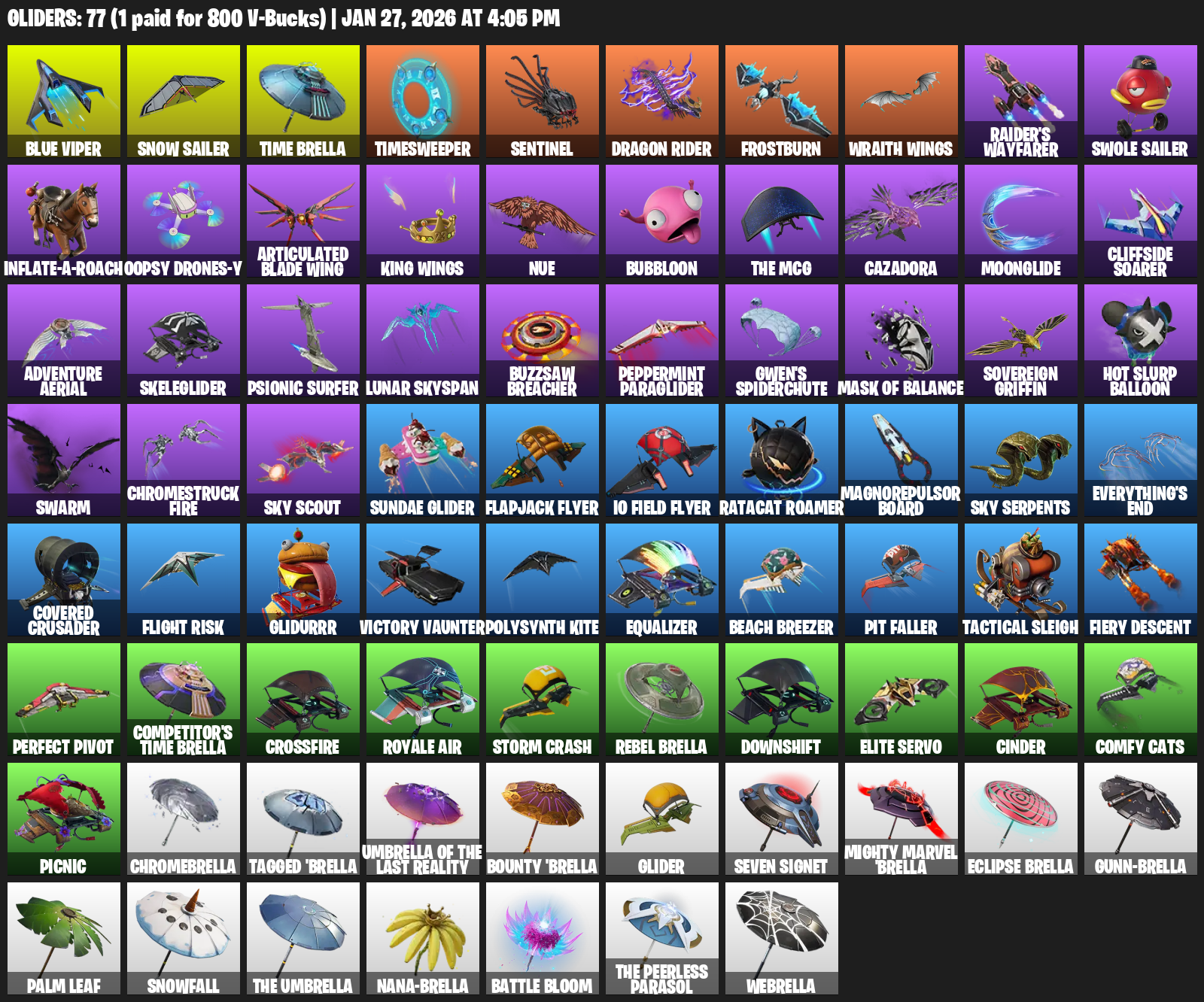 Blue Viper, Snow Sailer, Time Brella, Timesweeper, Sentinel, Dragon Rider, Frostburn, Wraith Wings, Raider’s Wayfarer, Oopsy Drones-y, Articulated Blade Wing, Nue, Bubbloon, Cazadora, Moonglide, Cliffside Soarer