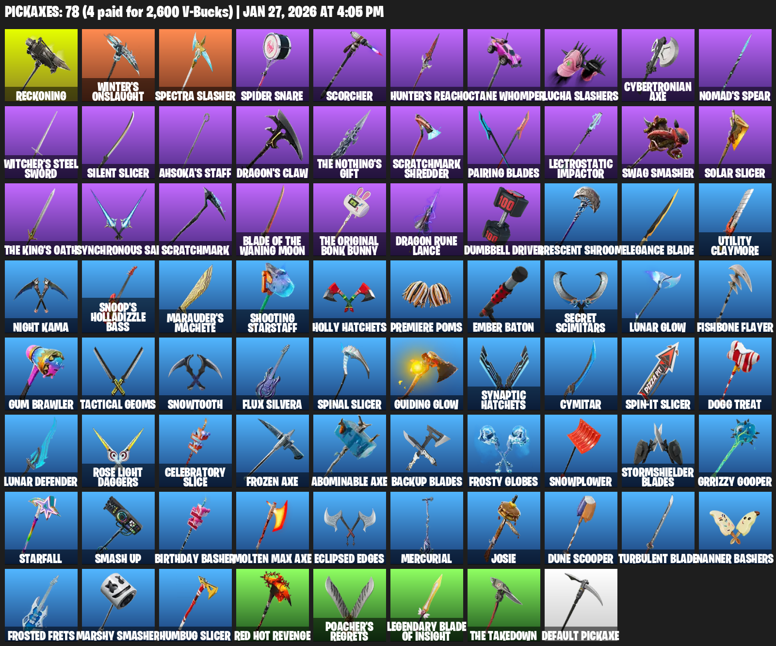 Reckoning, Winter’s Onslaught, Scorcher, Hunter’s Reach, Octane Whomper, Lucha Slashers, Cybertronian Axe, Nomad’s Spear, Witcher’s Steel Sword, Silent Slicer, Ahsoka’s Staff, Dragon’s Claw, The Nothing’s Gift, Scratchmark Shredder, Pairing Blades, Lectrostatic Impactor, Swag Smasher