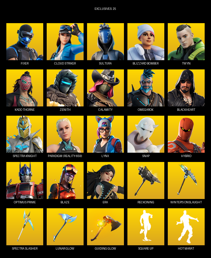 Fixer, Cloud Striker, Sultura, Blizzard Bomber, Twyn, Kado Thorne, Zenith, Calamity, Omegarok, Blackheart, Spectra Knight, Paradigm (Reality-659), Lynx, Snap, Hybrid, Optimus Prime, Blaze, Era, Spider-Gwen, Powder