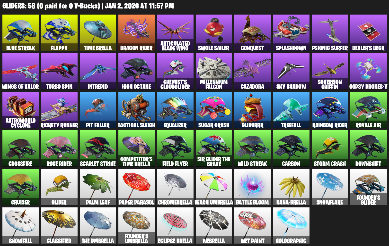 Flappy, Time Brella, Articulated Blade Wing, Swole Sailer, Conquest, Splashdown, Psionic Surfer, Dealer’s Deck, Wings of Valor, Turbo Spin, Intrepid, High Octane, Chemist’s Cloudglider, Millennium Falcon, Cazadora, Sovereign Griffin, Oopsy Drones-y