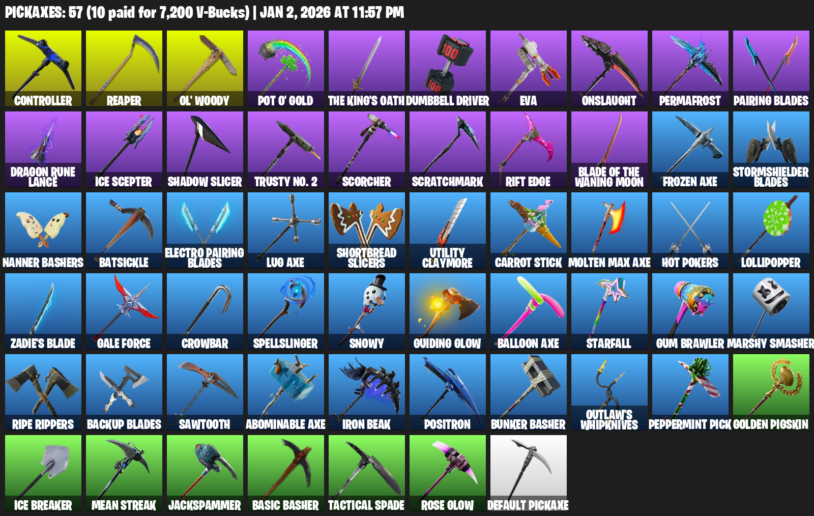 Controller, Ol’ Woody, Pot O’ Gold, Dumbbell Driver, EVA, Onslaught, Permafrost, Pairing Blades, Dragon Rune Lance, Ice Scepter, Shadow Slicer, Trusty No. 2, Scorcher, Scratchmark, Rift Edge
