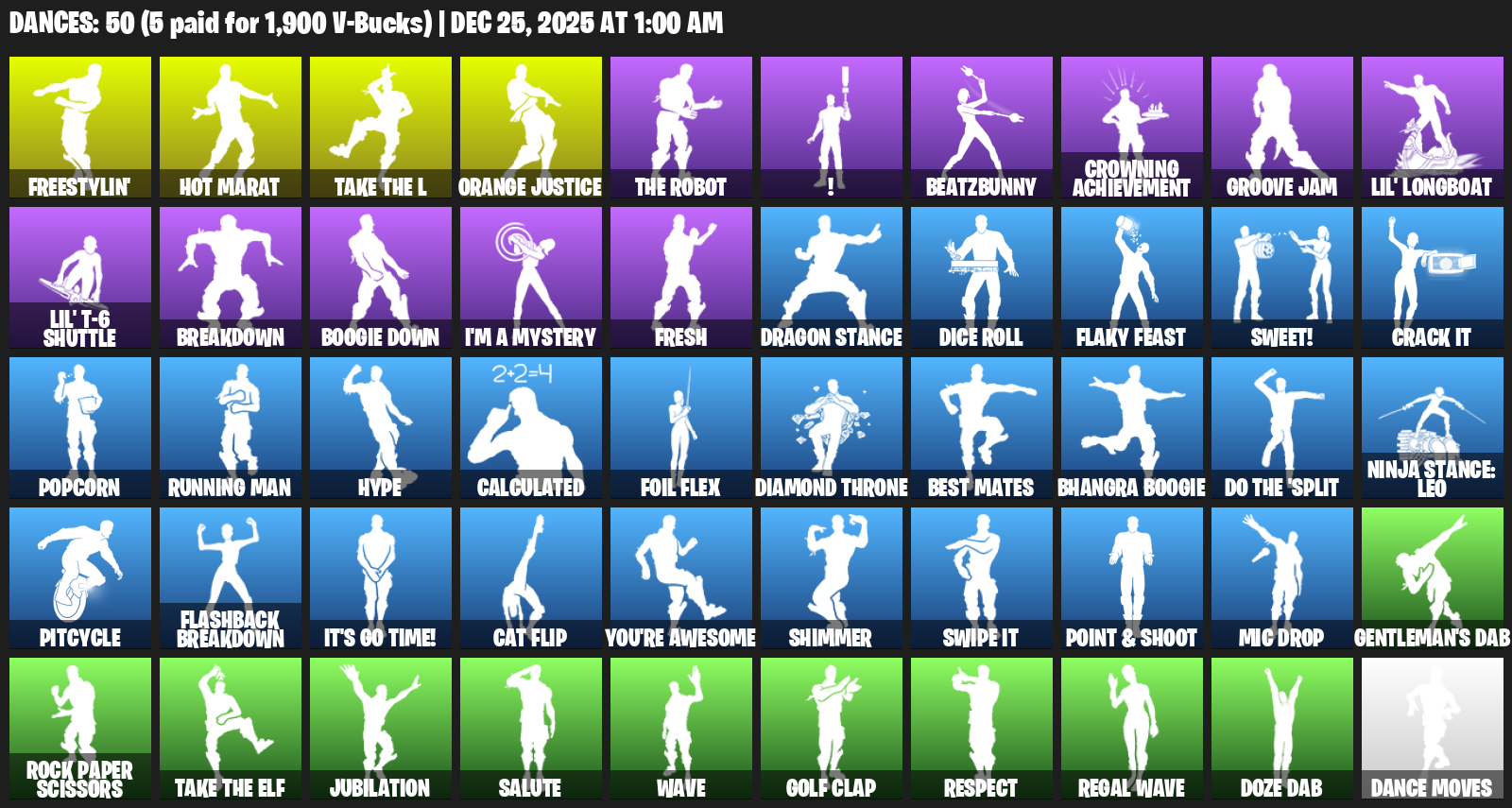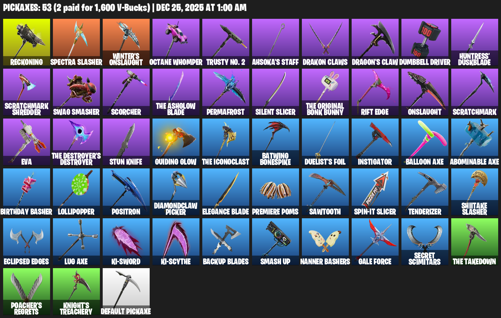 Reckoning, Winter’s Onslaught, Octane Whomper, Trusty No. 2, Ahsoka’s Staff, Drakon Claws, Dragon’s Claw, Dumbbell Driver, Huntress’ Duskblade, Scratchmark Shredder, Swag Smasher, Scorcher, Permafrost, Silent Slicer, Rift Edge