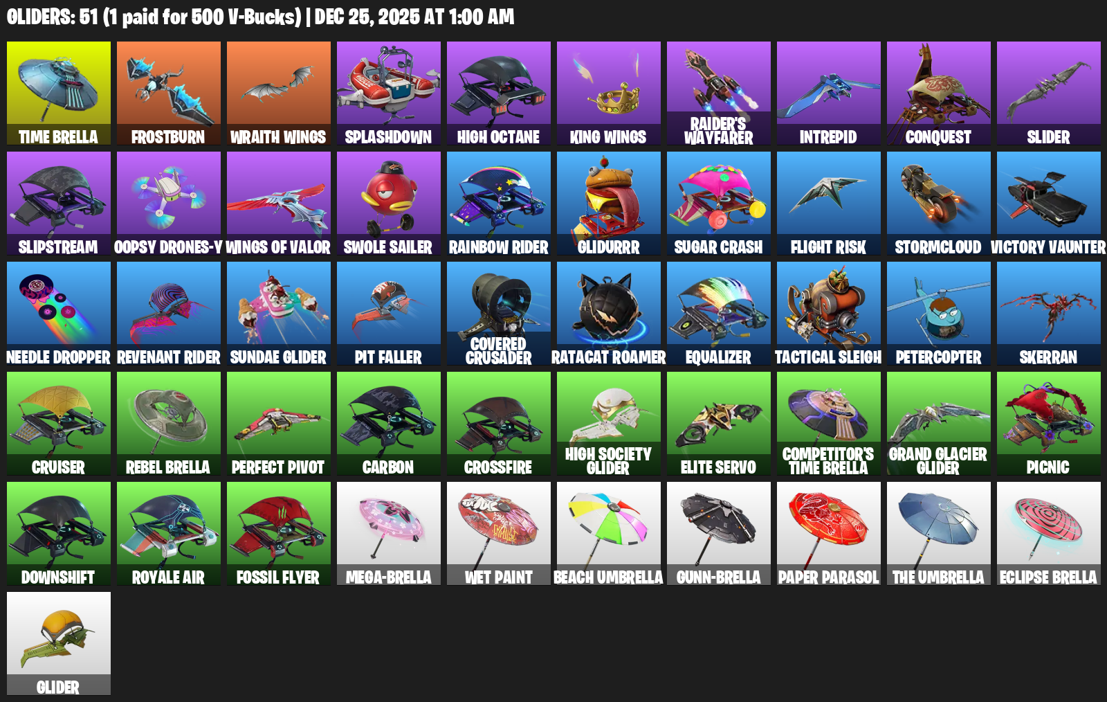 Time Brella, Frostburn, Wraith Wings, Splashdown, Raider’s Wayfarer, Intrepid, Conquest, Slider, Slipstream, Oopsy Drones-y, Swole Sailer, Rainbow Rider, Glidurrr, Sugar Crash, Flight Risk, Stormcloud, Victory Vaunter