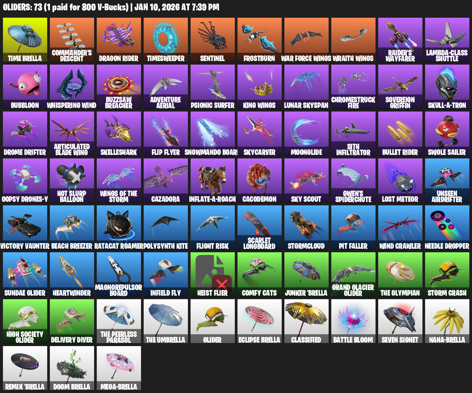 Time Brella, Commander’s Descent, Dragon Rider, Timesweeper, Sentinel, Frostburn, War Force Wings, Raider’s Wayfarer, Lambda-Class Shuttle, Bubbloon, Whispering Wind, Buzzsaw Breacher, Adventure Aerial, Psionic Surfer, Lunar Skyspan, Chromestruck Fire