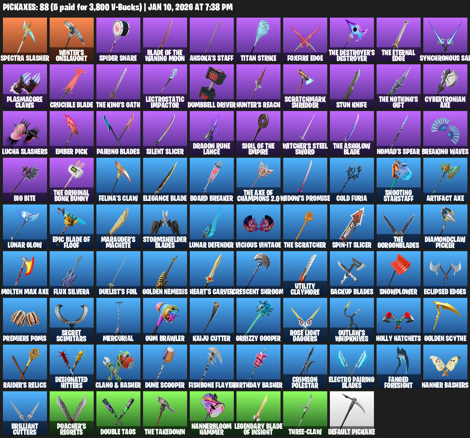 Winter’s Onslaught, Ahsoka’s Staff, Titan Strike, Foxfire Edge, Synchronous Sai, Plasmacore Claws, Crucible Blade, Lectrostatic Impactor, Dumbbell Driver, Hunter’s Reach, Scratchmark Shredder, Stun Knife, Cybertronian Axe
