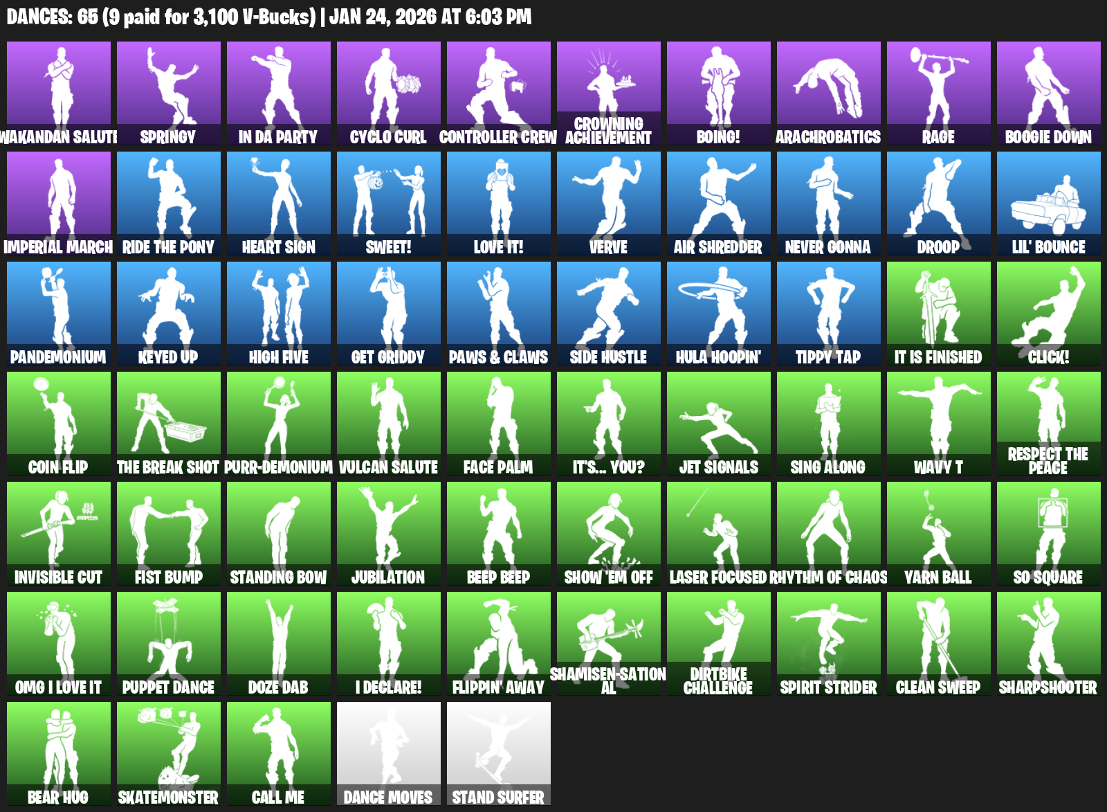 Wakandan Salute, Springy, In Da Party, Cyclo Curl, Controller Crew, Crowning Achievement, Boing!, Arachrobatics, Rage, Boogie Down, Imperial March, Heart Sign, Sweet!, Love it!, Verve, Air Shredder, Never Gonna, Droop, Lil’ Bounce