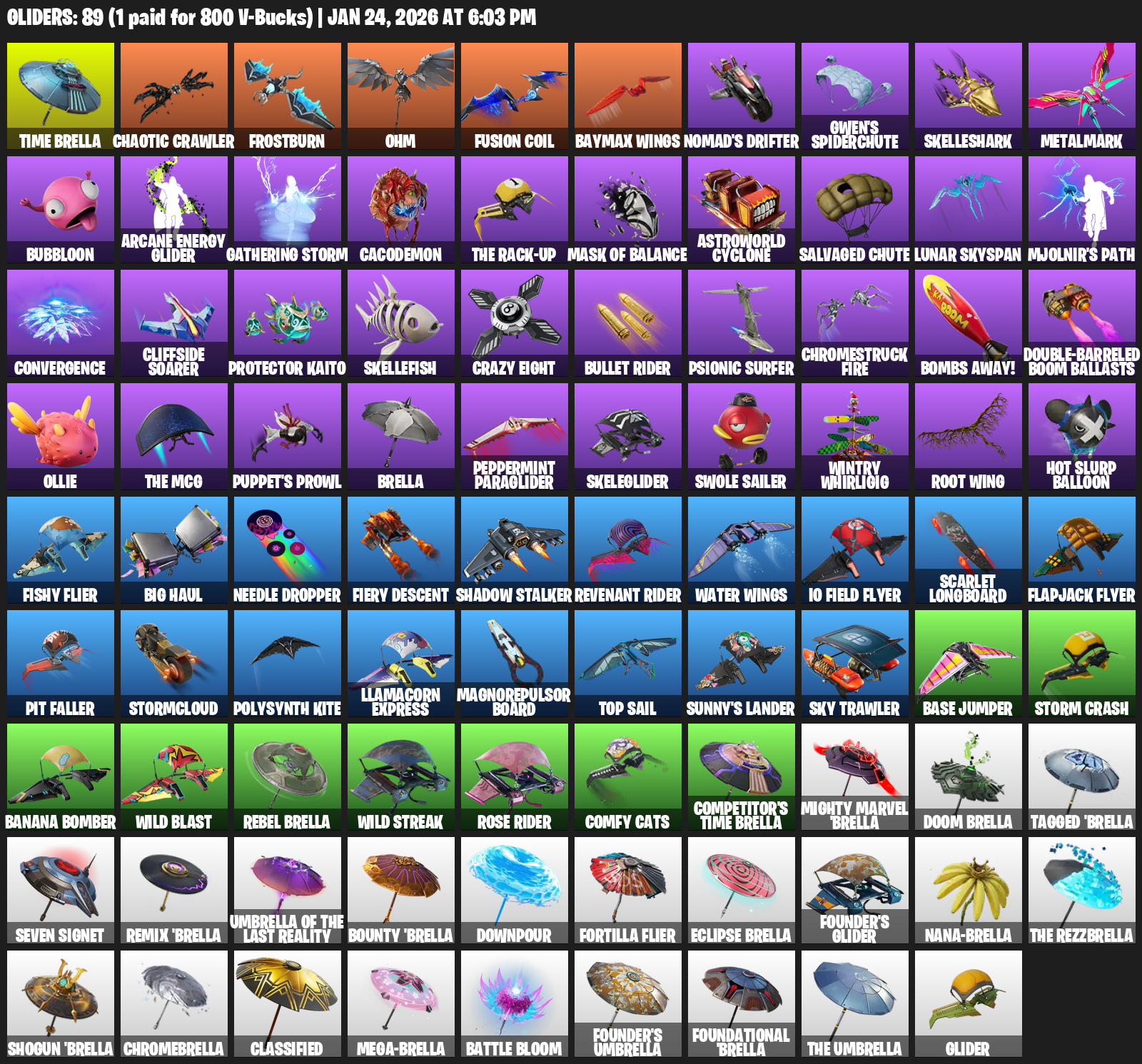 Time Brella, Chaotic Crawler, Frostburn, Ohm, Baymax Wings, Nomad’s Drifter, Gwen’s Spiderchute, Skelleshark, Metalmark, Bubbloon, Arcane Energy Glider, Gathering Storm, Cacodemon, Astroworld Cyclone, Salvaged Chute, Lunar Skyspan, Mjolnir’s Path