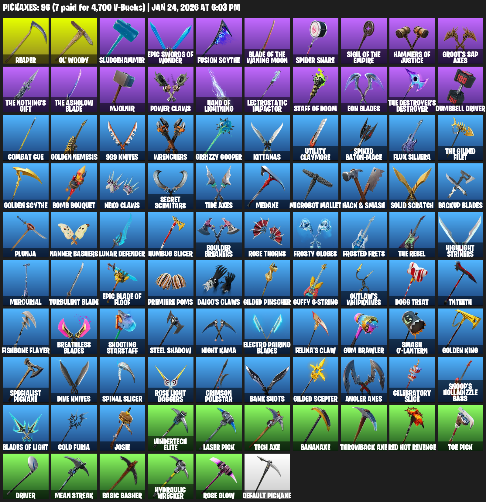Reaper, Ol’ Woody, Sludgehammer, Spider Snare, Hammers of Justice, Groot’s Sap Axes, Mjolnir, Power Claws, Lectrostatic Impactor, Eon Blades, Dumbbell Driver