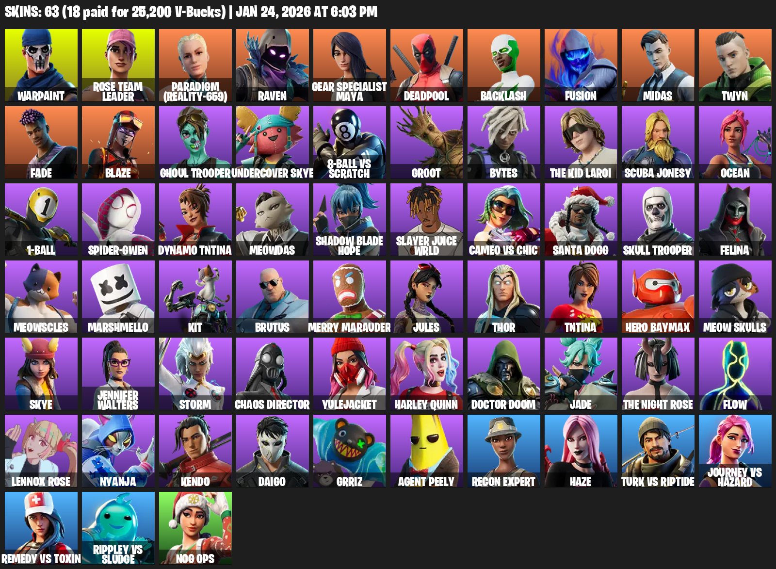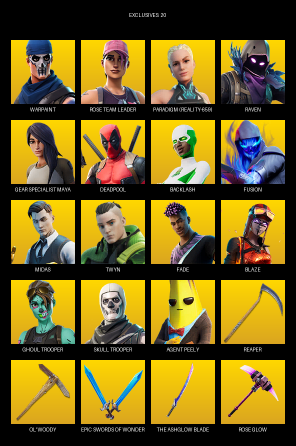 Gear Specialist Maya, Warpaint, Rose Team Leader, Paradigm (Reality-659), Raven, Deadpool, Backlash, Fusion, Midas, Twyn, Fade, Blaze, Ghoul Trooper, Undercover Skye, 8-Ball vs Scratch, Groot, Bytes, The Kid LAROI, Scuba Jonesy, Ocean