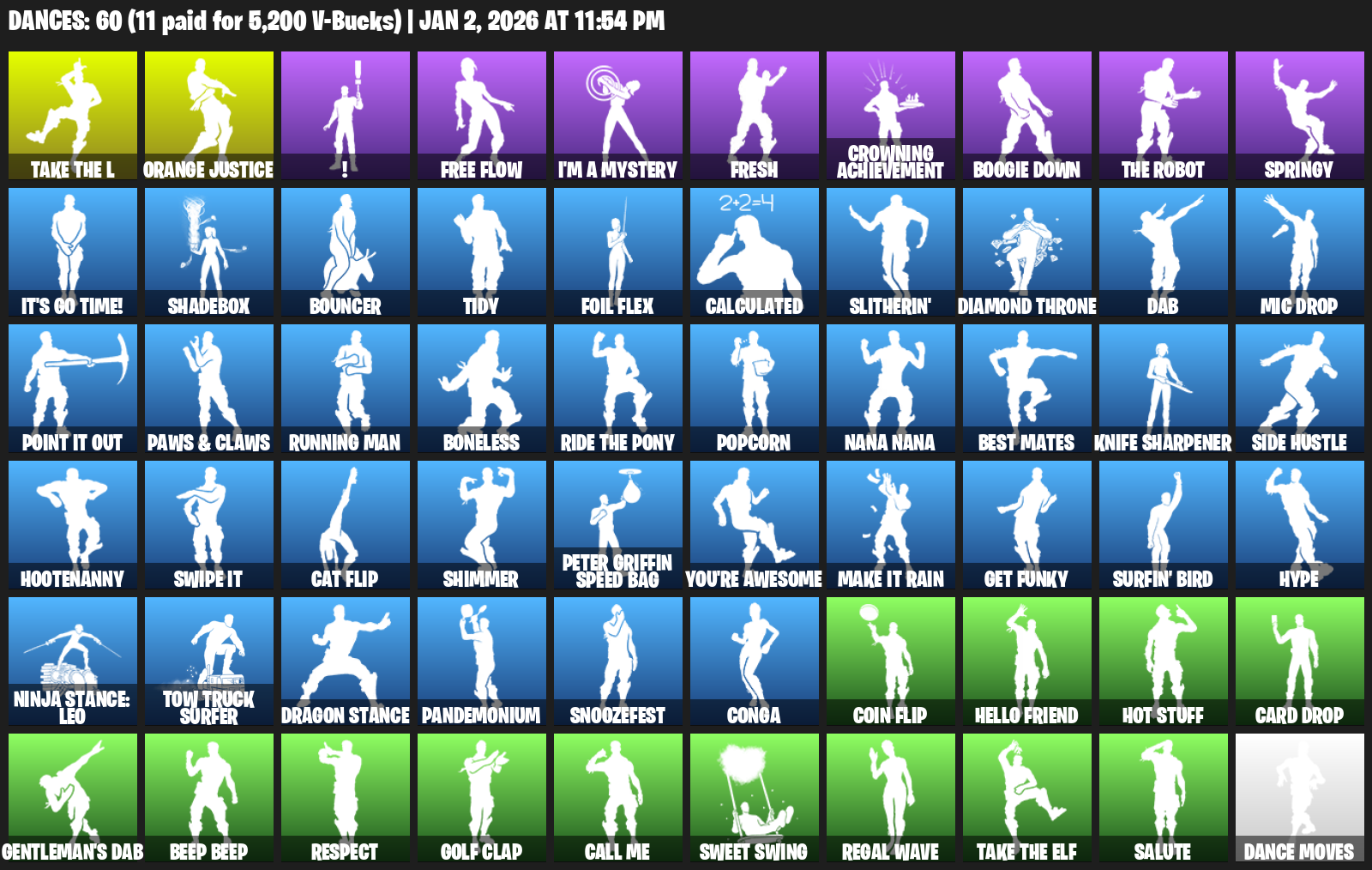 Orange Justice, !, Free Flow, I’m a Mystery, Fresh, Crowning Achievement, Boogie Down, Springy, It’s Go Time!, Shadebox, Bouncer, Tidy, Foil Flex, Calculated, Slitherin’, Diamond Throne, Dab, Mic Drop