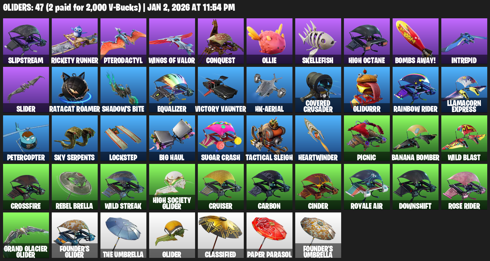 Slipstream, Rickety Runner, Pterodactyl, Conquest, Ollie, Skellefish, High Octane, Bombs Away!, Intrepid, Slider, Ratacat Roamer, Shadow’s Bite, Equalizer, Victory Vaunter, HK-Aerial, Covered Crusader, Glidurrr, Rainbow Rider, Llamacorn Express