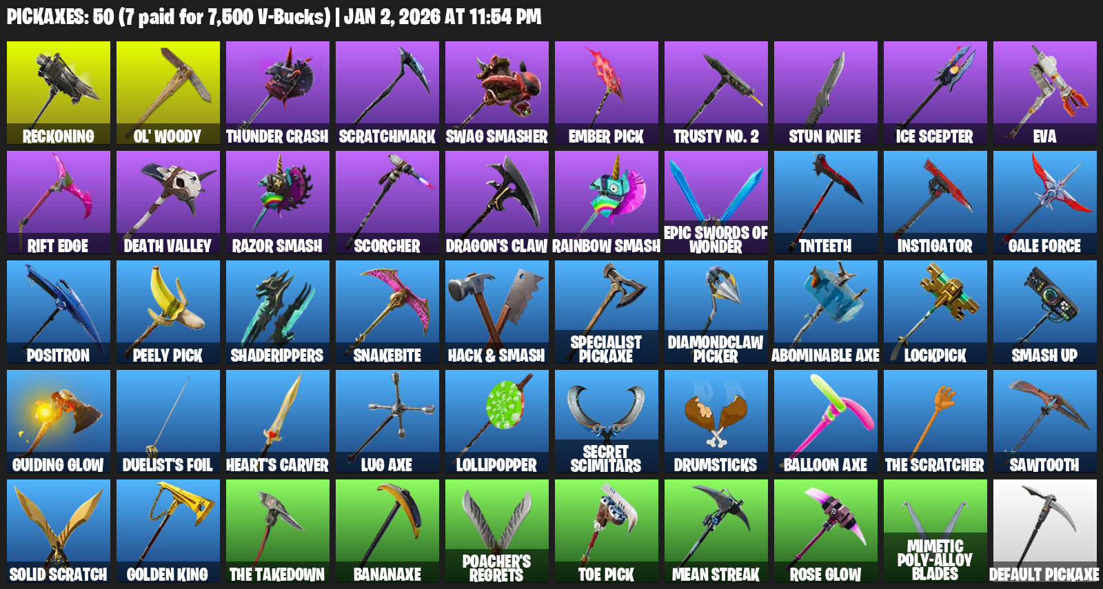 Reckoning, Ol’ Woody, Thunder Crash, Scratchmark, Swag Smasher, Ember Pick, Trusty No. 2, Stun Knife, Ice Scepter, EVA, Rift Edge, Death Valley, Razor Smash, Scorcher, Dragon’s Claw, TNTeeth, Instigator, Gale Force