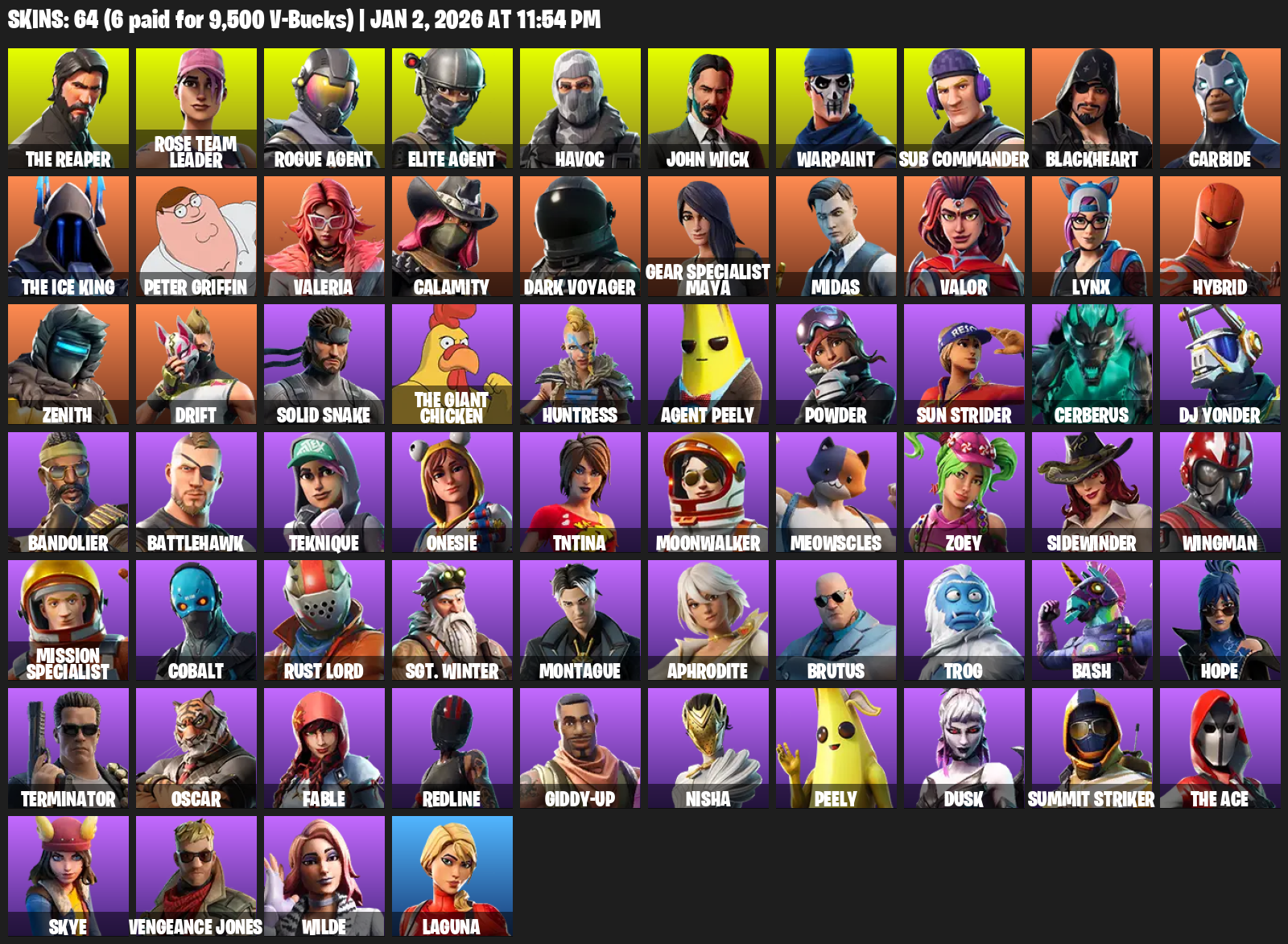 [PC/PSN/XBOX] | 64 skins | Take The L | OG STW | The Reaper | Elite Agent | Rose Team Leader | Rogue Agent | Havoc | John Wick | Warpaint | #EDA9546