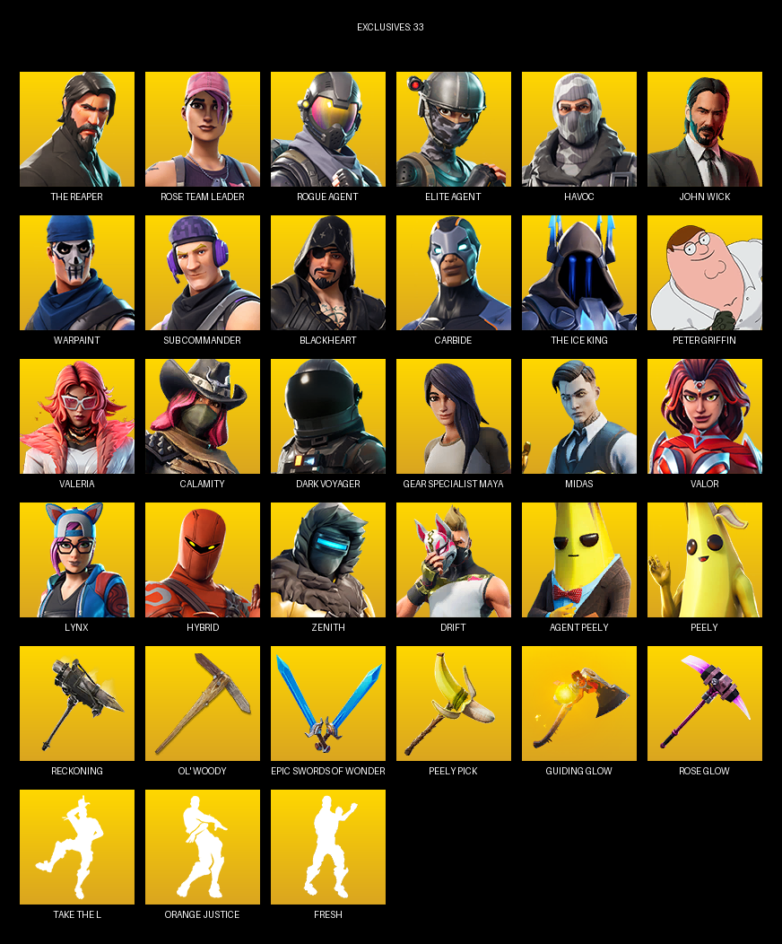 The Reaper, Elite Agent, Gear Specialist Maya, Rose Team Leader, Havoc, John Wick, Warpaint, Sub Commander, Blackheart, Carbide, Peter Griffin, Valeria, Calamity, Dark Voyager, Midas, Valor, Lynx, Hybrid