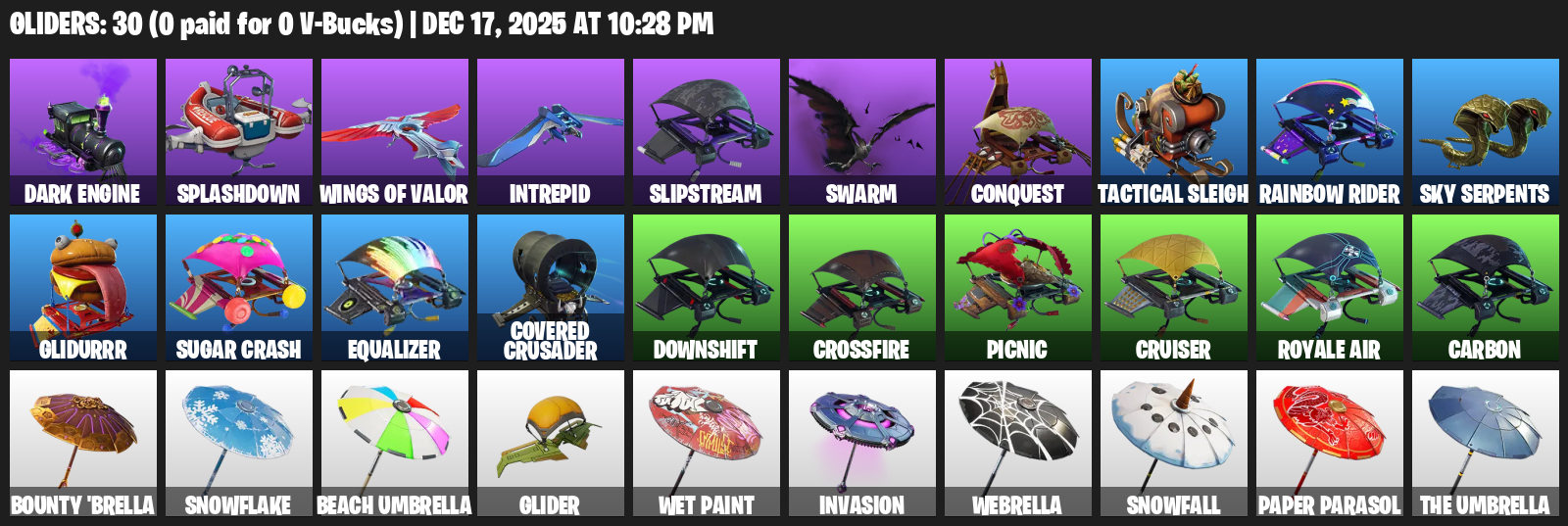 Dark Engine, Splashdown, Intrepid, Slipstream, Swarm, Conquest, Tactical Sleigh, Rainbow Rider, Glidurrr, Equalizer, Covered Crusader, Downshift, Crossfire, Picnic, Cruiser, Royale Air, Carbon