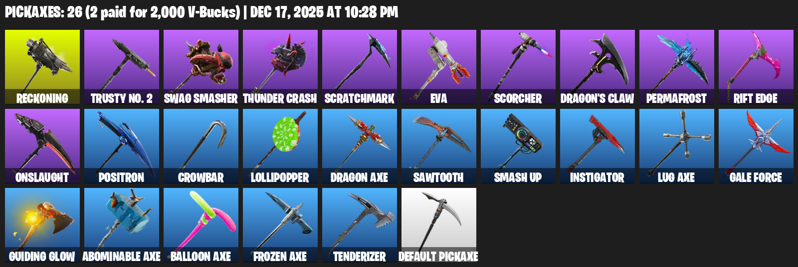 Reckoning, Trusty No. 2, Swag Smasher, Thunder Crash, Scratchmark, EVA, Scorcher, Dragon’s Claw, Permafrost, Rift Edge, Onslaught, Positron, Crowbar, Lollipopper, Dragon Axe, Sawtooth, Smash Up, Instigator, Gale Force