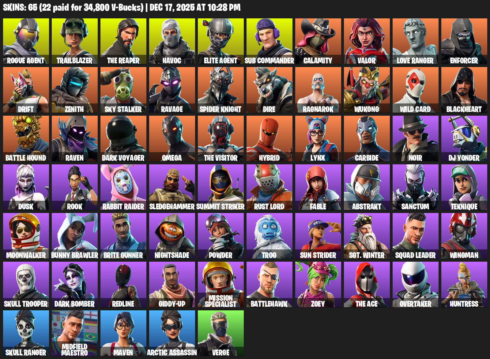 The Reaper, Elite Agent, Omega, Trailblazer, Havoc, Sub Commander, Calamity, Valor, Love Ranger, Enforcer, Drift, Zenith, Sky Stalker, Ravage, Spider Knight, Dire, Ragnarok, Wukong, Wild Card
