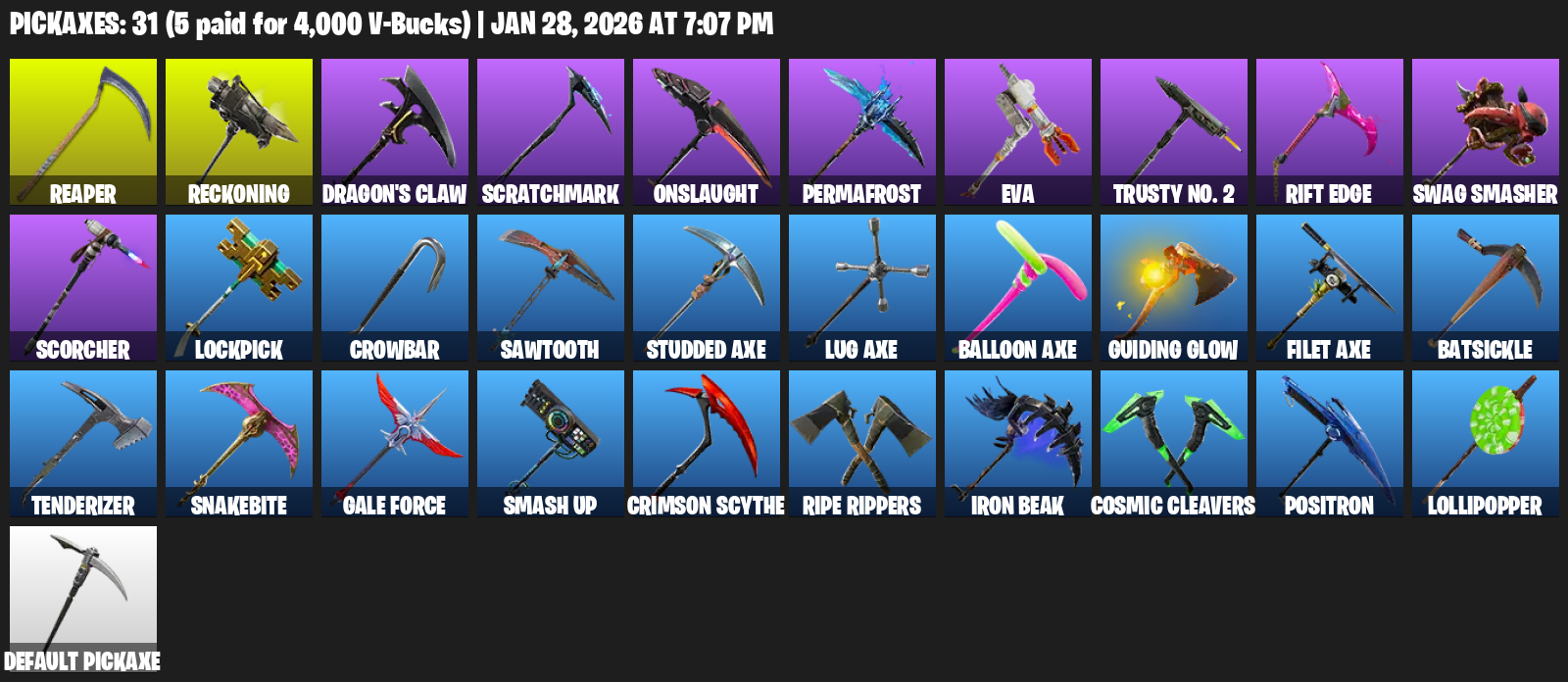 Reckoning, Dragon’s Claw, Scratchmark, Onslaught, Permafrost, EVA, Trusty No. 2, Rift Edge, Swag Smasher, Scorcher, Lockpick, Crowbar, Sawtooth, Studded Axe, Guiding Glow, Batsickle