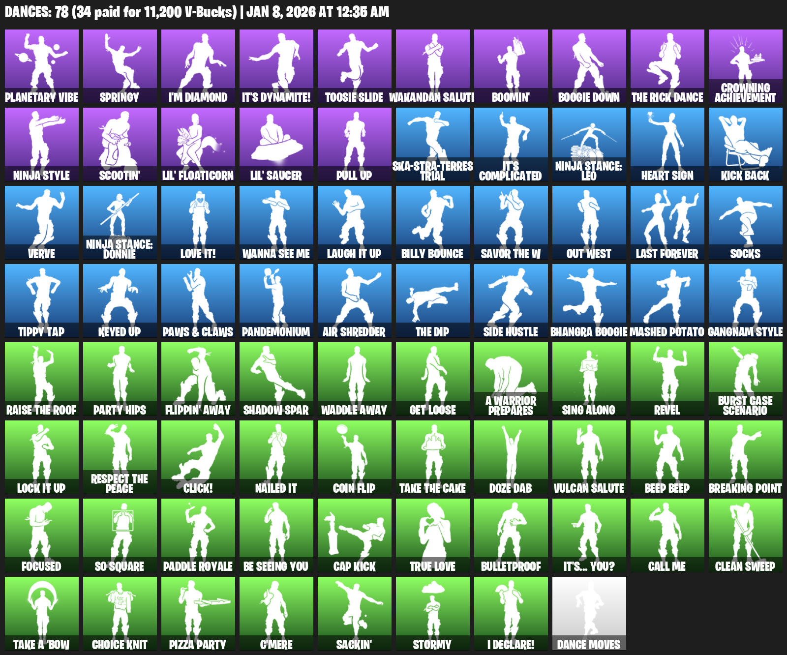 Planetary Vibe, Springy, I’m Diamond, It’s Dynamite!, Toosie Slide, Wakandan Salute, Boomin’, Boogie Down, Crowning Achievement, Ninja Style, Scootin’, Lil’ Floaticorn, Pull Up, Ska-stra-terrestrial, Heart Sign, Kick Back