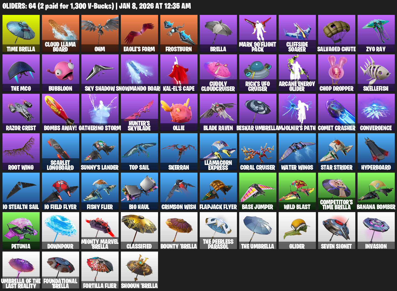 Time Brella, Cloud Llama Board, Ohm, Eagle’s Form, Frostburn, Cliffside Soarer, Salvaged Chute, Zyg Ray, Bubbloon, Sky Shadow, Kal-El’s Cape, Cuddly Cloudcruiser, Rick’s UFO Cruiser, Chop Dropper, Skellefish