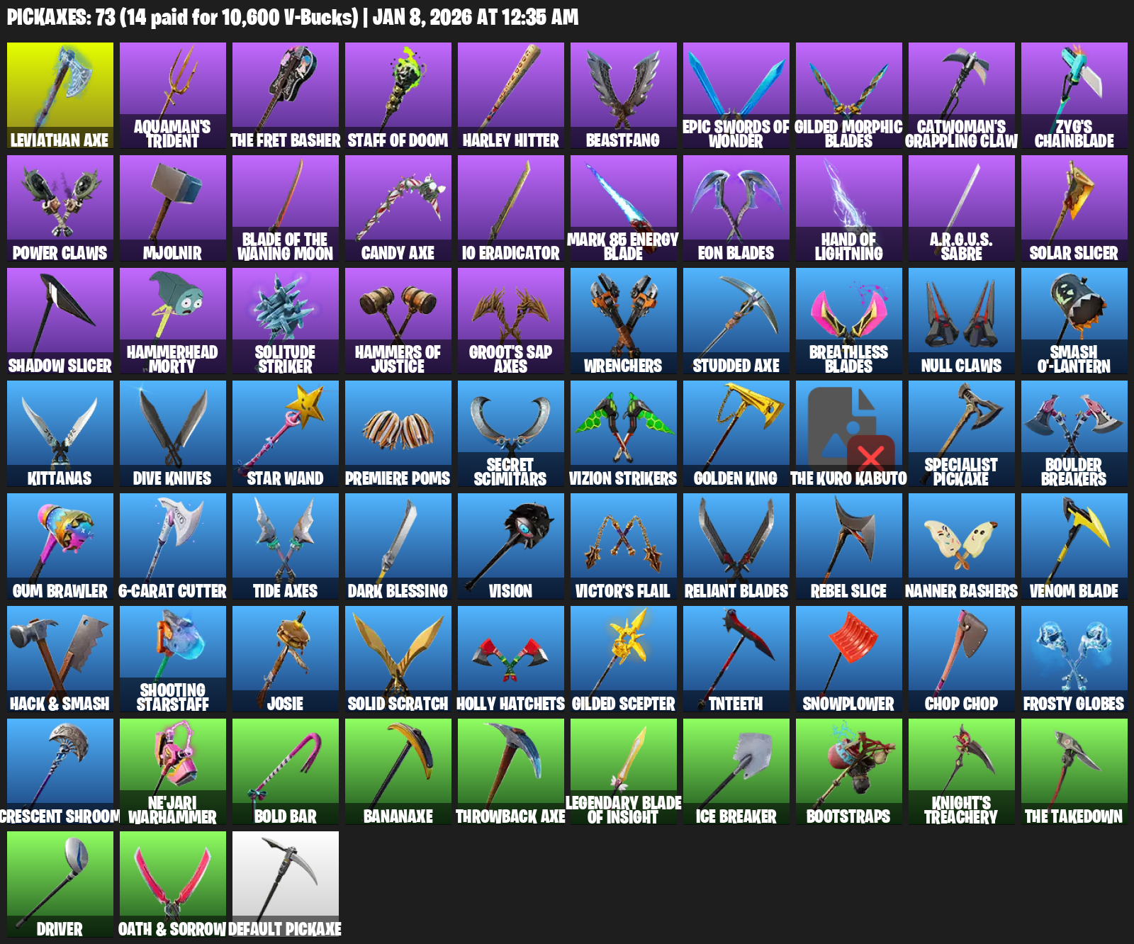 Leviathan Axe, Aquaman’s Trident, The Fret Basher, Staff of Doom, Harley Hitter, Beastfang, Gilded Morphic Blades, Catwoman’s Grappling Claw, Zyg’s Chainblade, Power Claws, Mjolnir, IO Eradicator, Mark 85 Energy Blade, A.R.G.U.S. Sabre, Solar Slicer