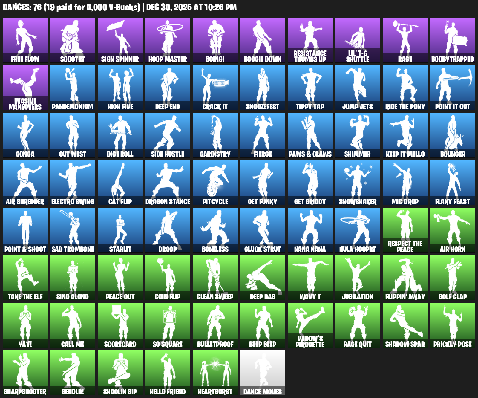 Free Flow, Scootin’, Sign Spinner, Hoop Master, Boing!, Boogie Down, Resistance Thumbs Up, Lil’ T-6 Shuttle, Rage, Boobytrapped, Evasive Maneuvers, Pandemonium, High Five, Deep End, Crack It, Snoozefest, Tippy Tap, Jump Jets