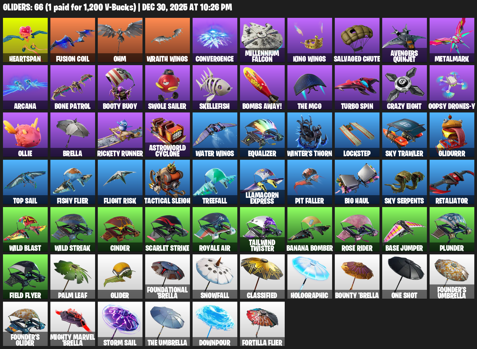 Heartspan, Ohm, Wraith Wings, Convergence, Millennium Falcon, Salvaged Chute, Avengers Quinjet, Metalmark, Arcana, Bone Patrol, Booty Buoy, Swole Sailer, Skellefish, Bombs Away!, Turbo Spin, Crazy Eight, Oopsy Drones-y