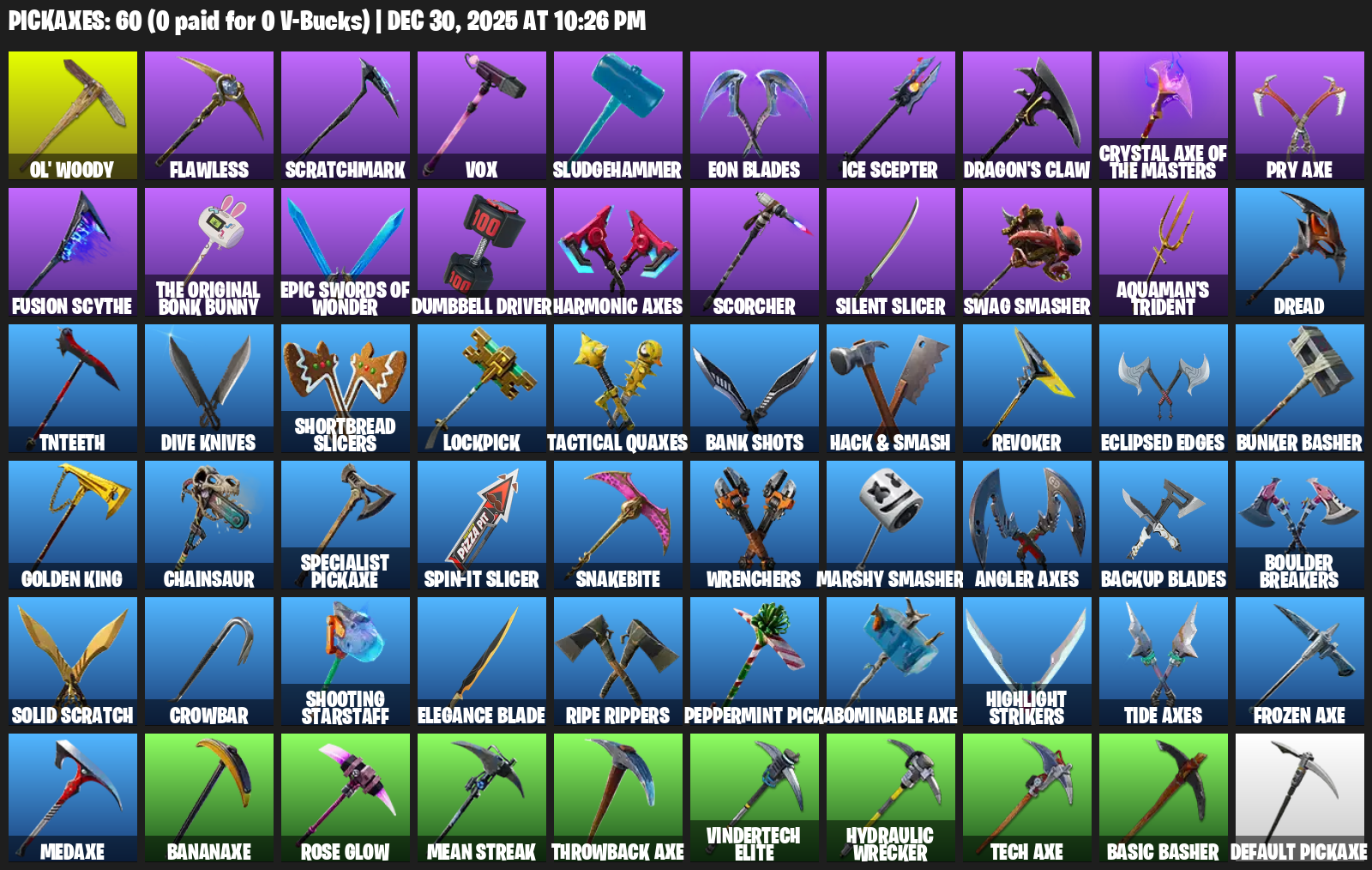 Ol’ Woody, Flawless, Scratchmark, Vox, Sludgehammer, Eon Blades, Ice Scepter, Dragon’s Claw, Pry Axe, Dumbbell Driver, Harmonic Axes, Scorcher, Silent Slicer, Swag Smasher, Aquaman’s Trident, Dread