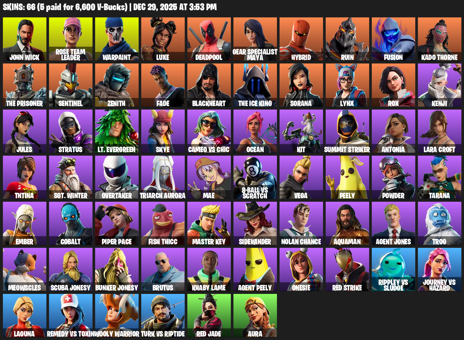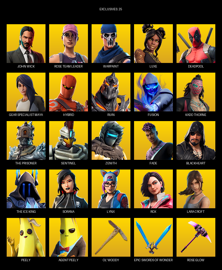 Gear Specialist Maya, Lara Croft, John Wick, Rose Team Leader, Warpaint, Luxe, Deadpool, Hybrid, Ruin, Fusion, Kado Thorne, The Prisoner, Sentinel, Zenith, Fade, Blackheart, Sorana, Lynx, Rox