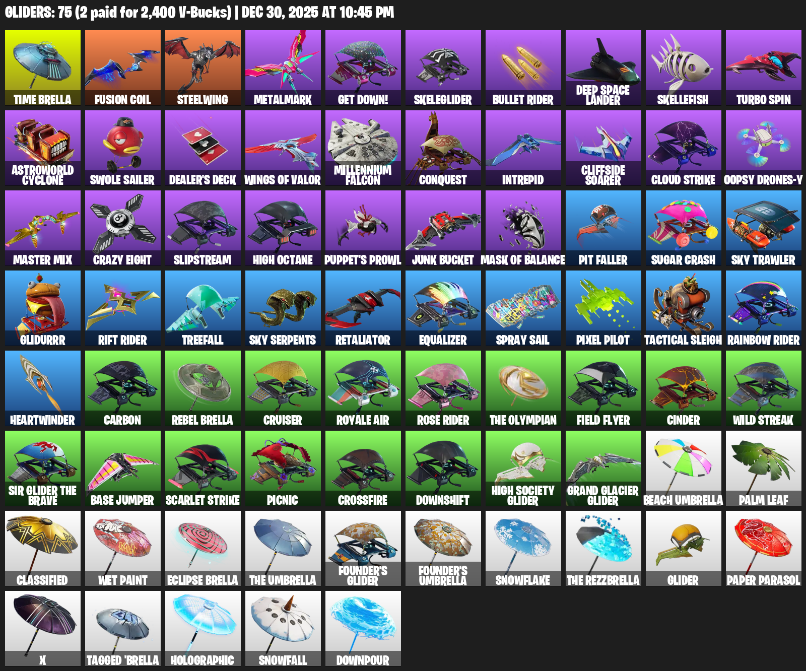 Time Brella, Steelwing, Metalmark, Get Down!, Skeleglider, Bullet Rider, Deep Space Lander, Skellefish, Turbo Spin, Astroworld Cyclone, Swole Sailer, Dealer’s Deck, Wings of Valor, Millennium Falcon, Conquest, Intrepid, Cliffside Soarer, Cloud Strike, Oopsy Drones-y