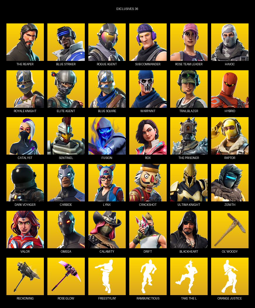 The Reaper, Royale Knight, Elite Agent, Blue Squire, Omega, Sub Commander, Rose Team Leader, Havoc, Warpaint, Trailblazer, Hybrid, Catalyst, Sentinel, Fusion, Rox, Raptor, Dark Voyager