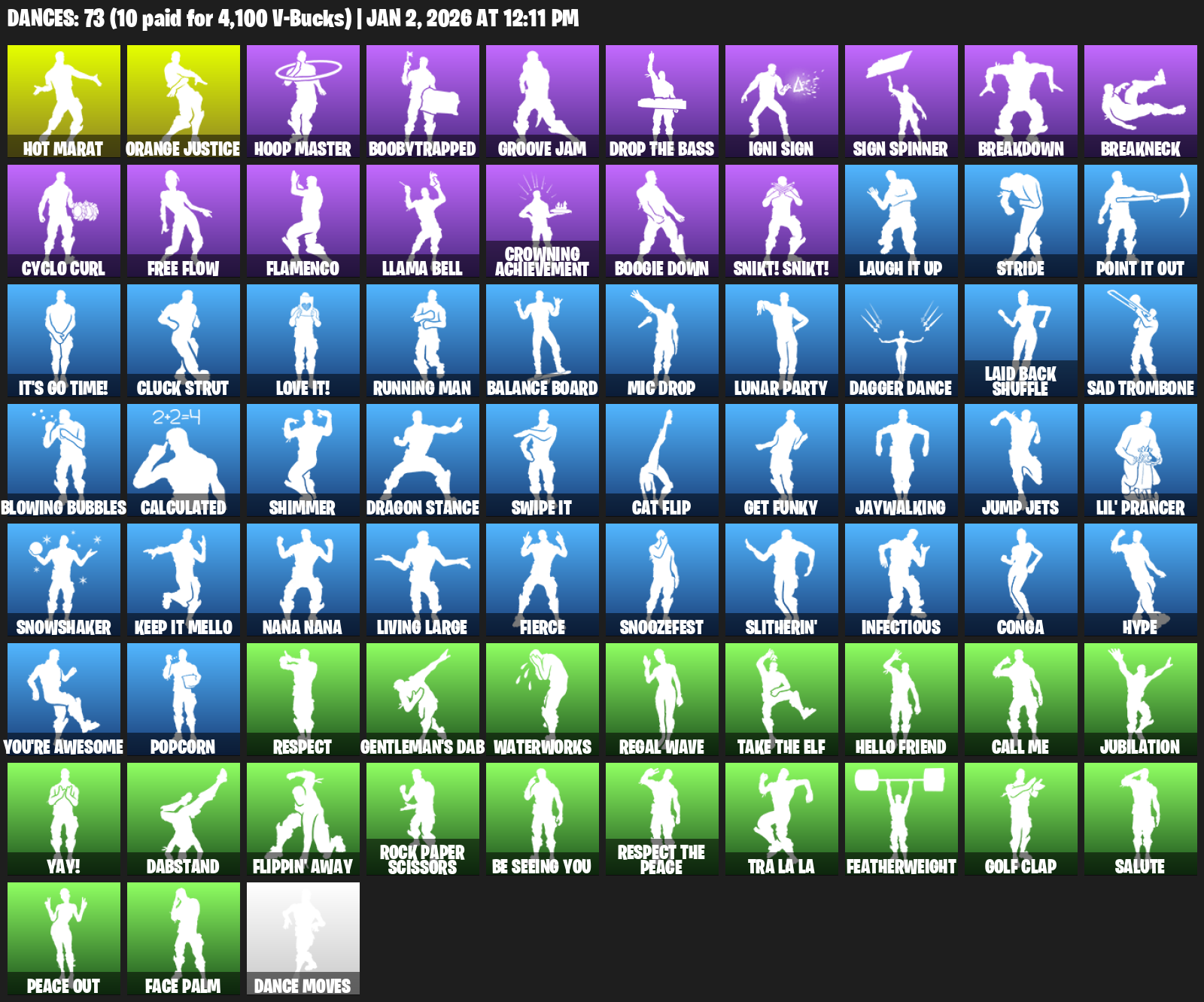 Hot Marat, Orange Justice, Hoop Master, Boobytrapped, Groove Jam, Igni Sign, Breakdown, Breakneck, Cyclo Curl, Free Flow, Flamenco, Llama Bell, Crowning Achievement, Boogie Down, Snikt! Snikt!, Laugh It Up, Stride