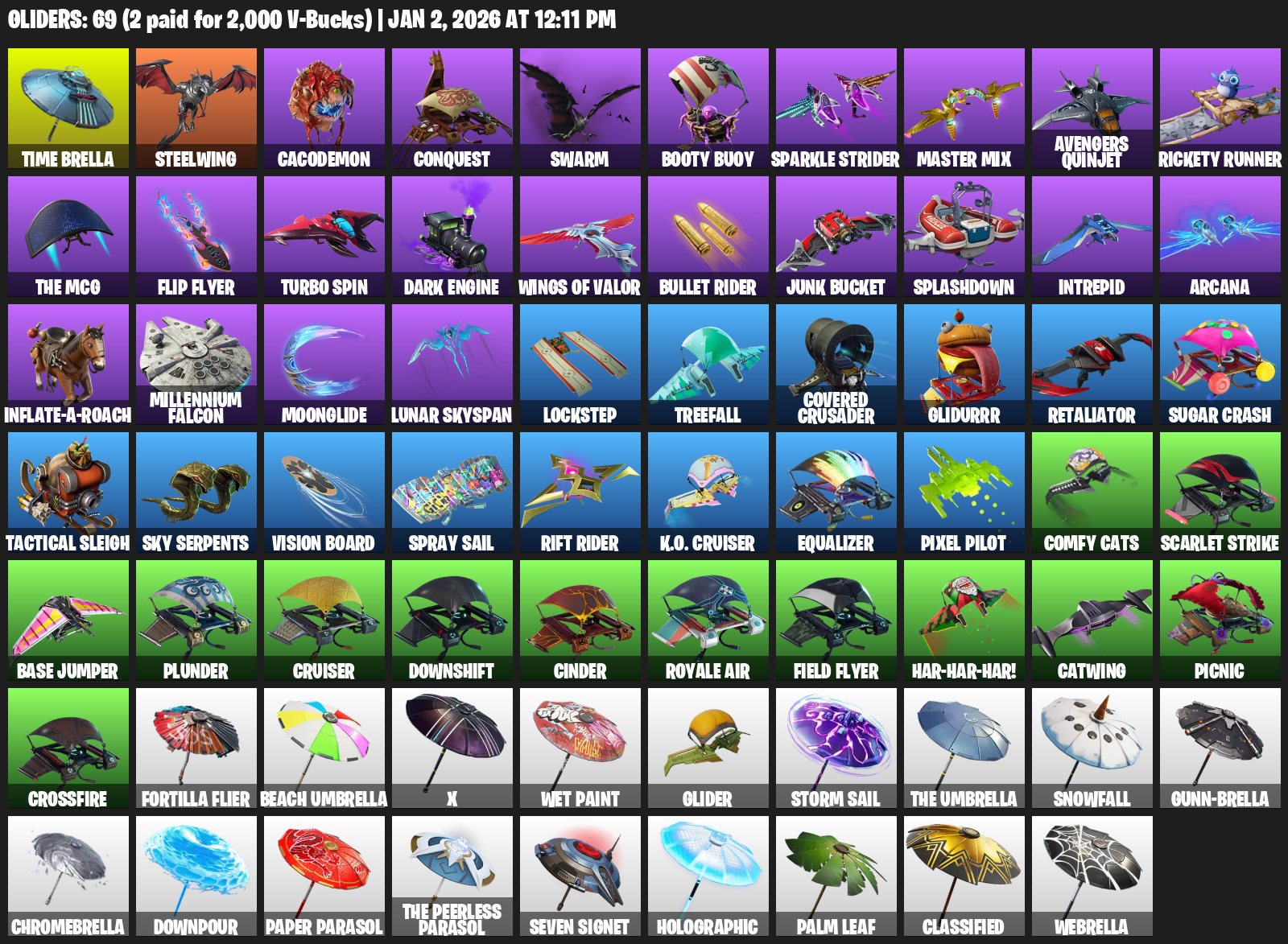 Time Brella, Steelwing, Cacodemon, Conquest, Swarm, Booty Buoy, Sparkle Strider, Avengers Quinjet, Rickety Runner, Flip Flyer, Turbo Spin, Dark Engine, Wings of Valor, Bullet Rider, Junk Bucket, Splashdown, Intrepid, Arcana