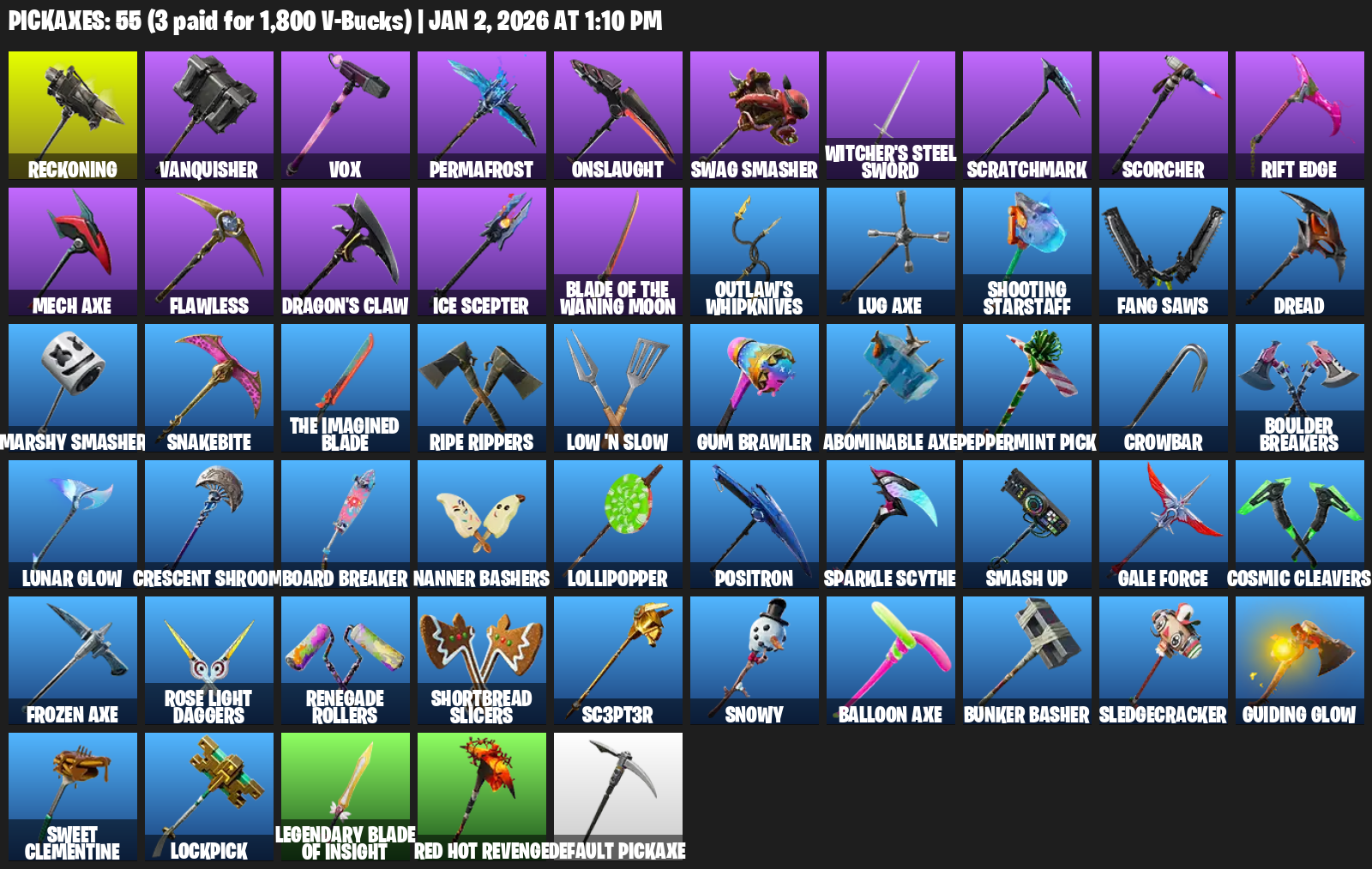 Reckoning, Vanquisher, Vox, Permafrost, Onslaught, Swag Smasher, Witcher’s Steel Sword, Scratchmark, Scorcher, Rift Edge, Mech Axe, Flawless, Dragon’s Claw, Ice Scepter, Outlaw’s Whipknives, Shooting Starstaff, Fang Saws, Dread