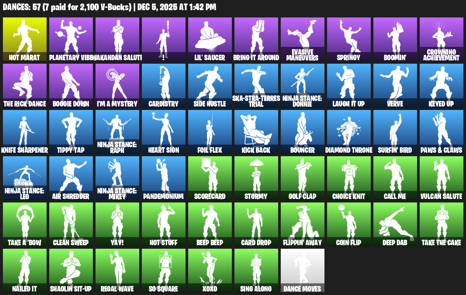 Hot Marat, Planetary Vibe, Wakandan Salute, !, Lil’ Saucer, Bring it around, Evasive Maneuvers, Springy, Boomin’, Crowning Achievement, Boogie Down, I’m a Mystery, Cardistry, Side Hustle, Ska-stra-terrestrial, Ninja Stance: Donnie, Verve, Keyed Up