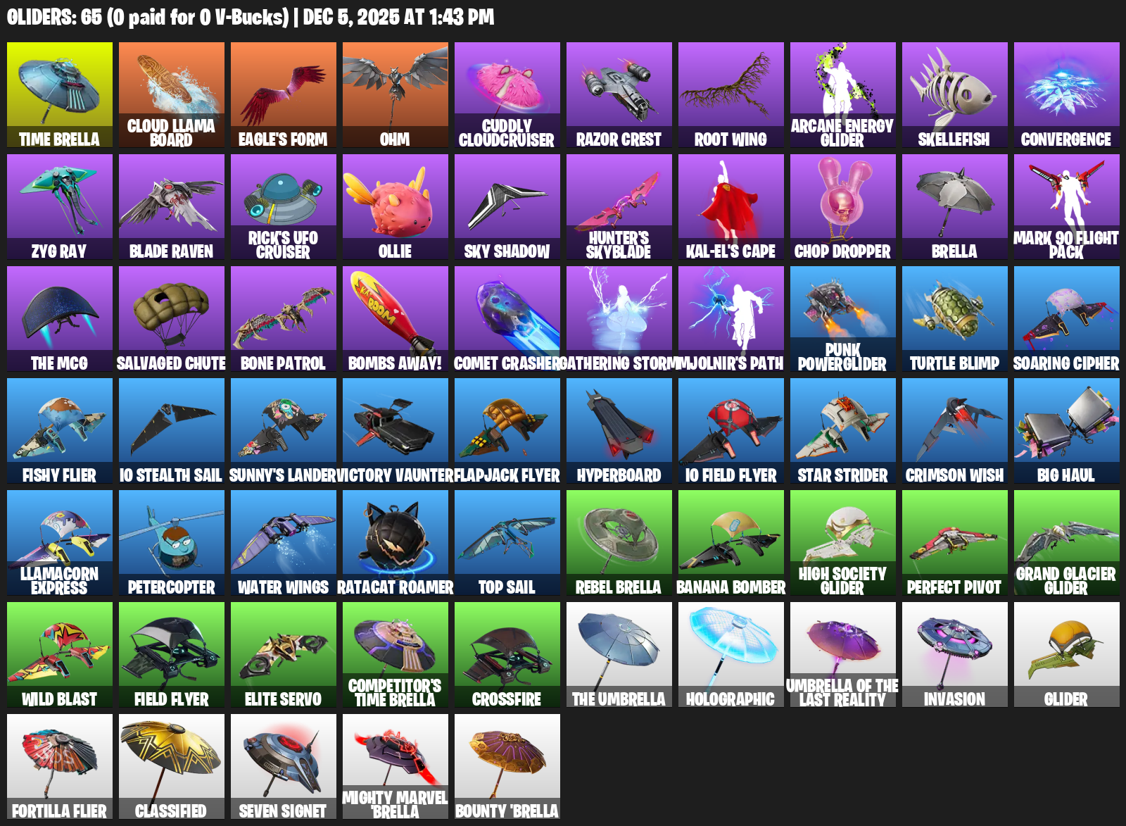 Time Brella, Cloud Llama Board, Eagle’s Form, Ohm, Cuddly Cloudcruiser, Razor Crest, Root Wing, Skellefish, Convergence, Zyg Ray, Rick’s UFO Cruiser, Ollie, Hunter’s Skyblade, Kal-El’s Cape, Chop Dropper