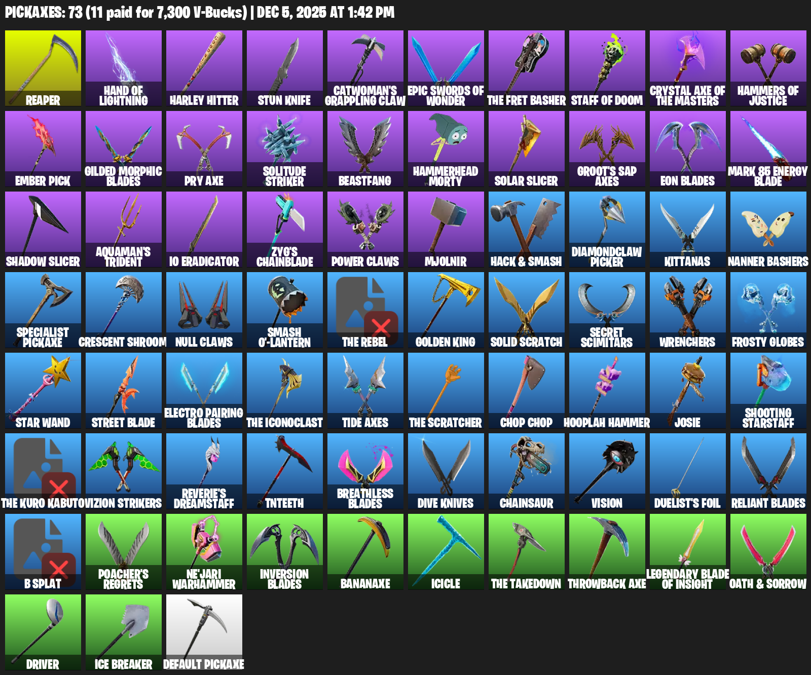 Reaper, Hand of Lightning, Harley Hitter, Stun Knife, Catwoman’s Grappling Claw, The Fret Basher, Ember Pick, Gilded Morphic Blades, Pry Axe, Solitude Striker, Beastfang, Hammerhead Morty, Solar Slicer, Groot’s Sap Axes, Mark 85 Energy Blade