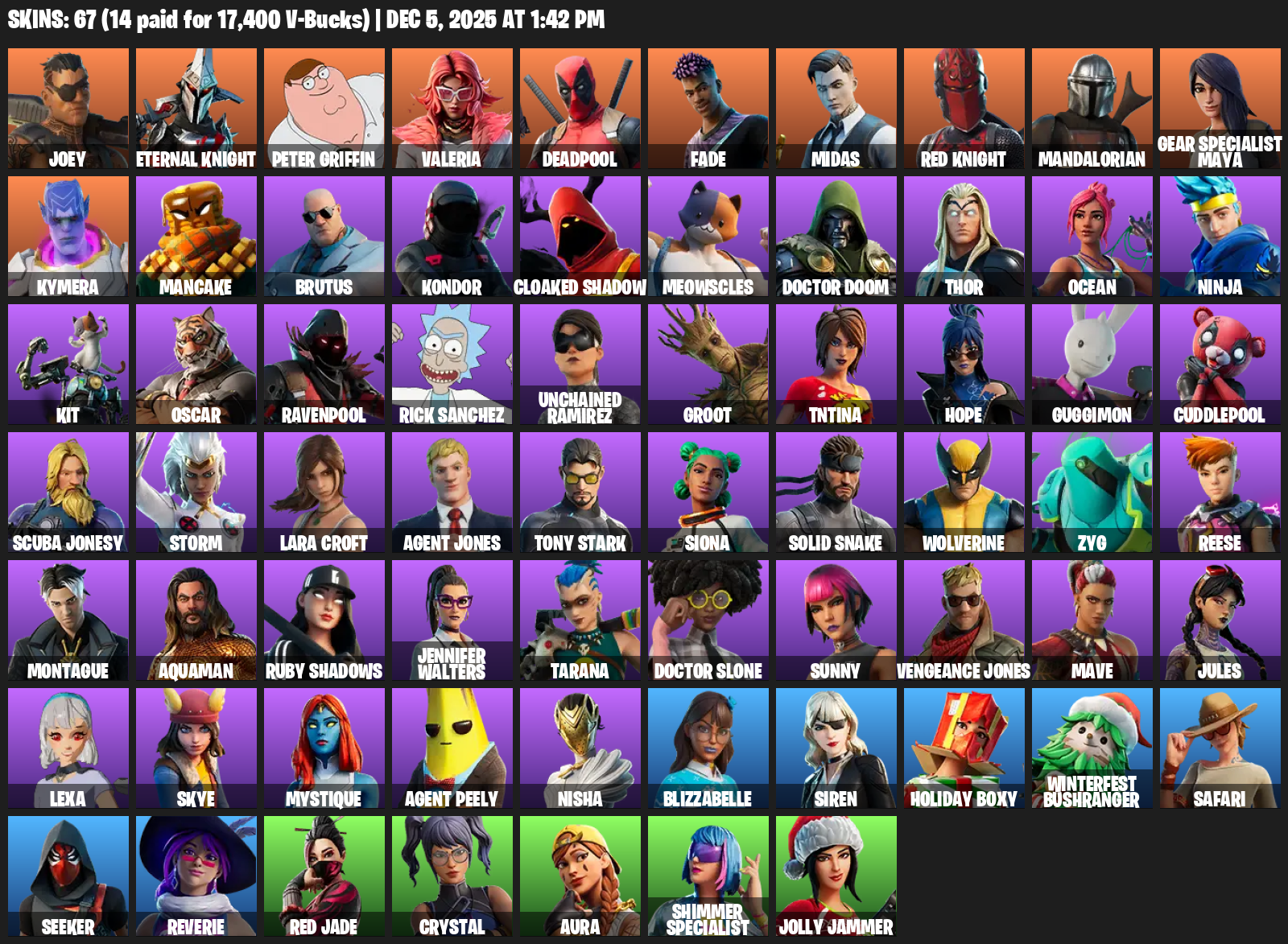 Gear Specialist Maya, Lara Croft, Joey, Eternal Knight, Peter Griffin, Valeria, Deadpool, Fade, Midas, Mandalorian, Kymera, Mancake, Brutus, Kondor, Cloaked Shadow, Meowscles, Doctor Doom, Thor, Ocean