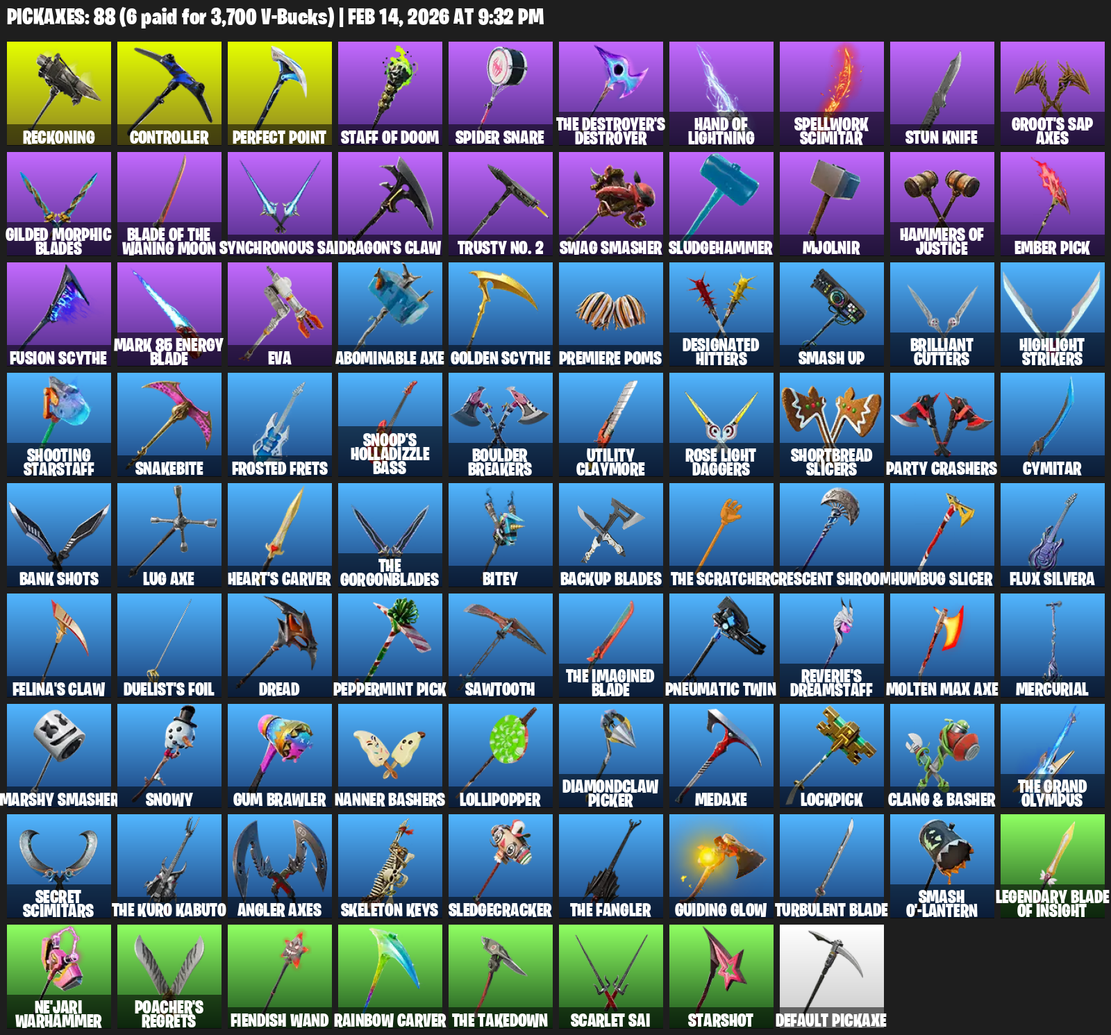 Reckoning, Controller, Perfect Point, Staff of Doom, Spider Snare, The Destroyer’s Destroyer, Spellwork Scimitar, Stun Knife, Groot’s Sap Axes, Gilded Morphic Blades, Synchronous Sai, Dragon’s Claw, Trusty No. 2, Swag Smasher, Sludgehammer, Mjolnir, Ember Pick