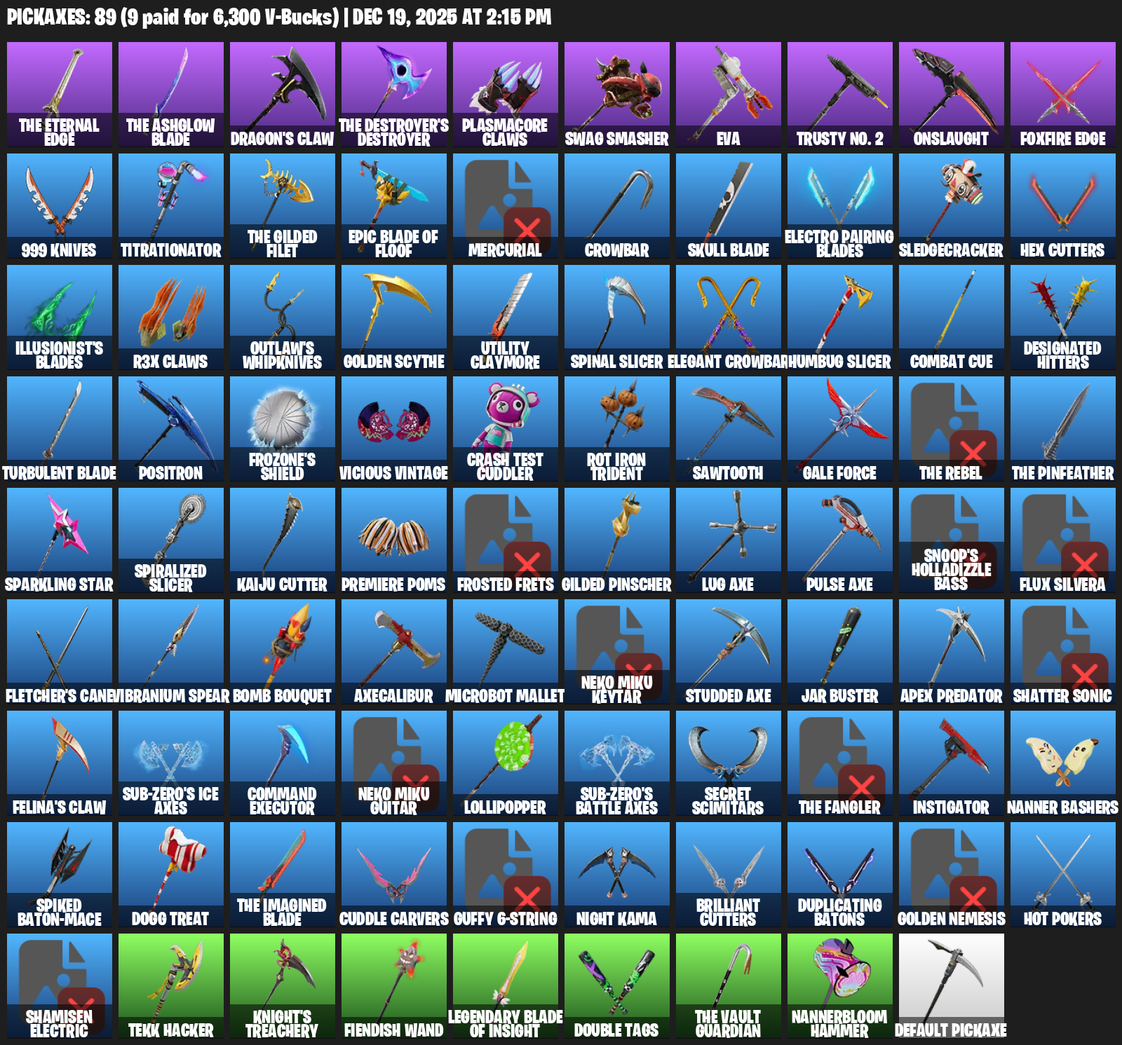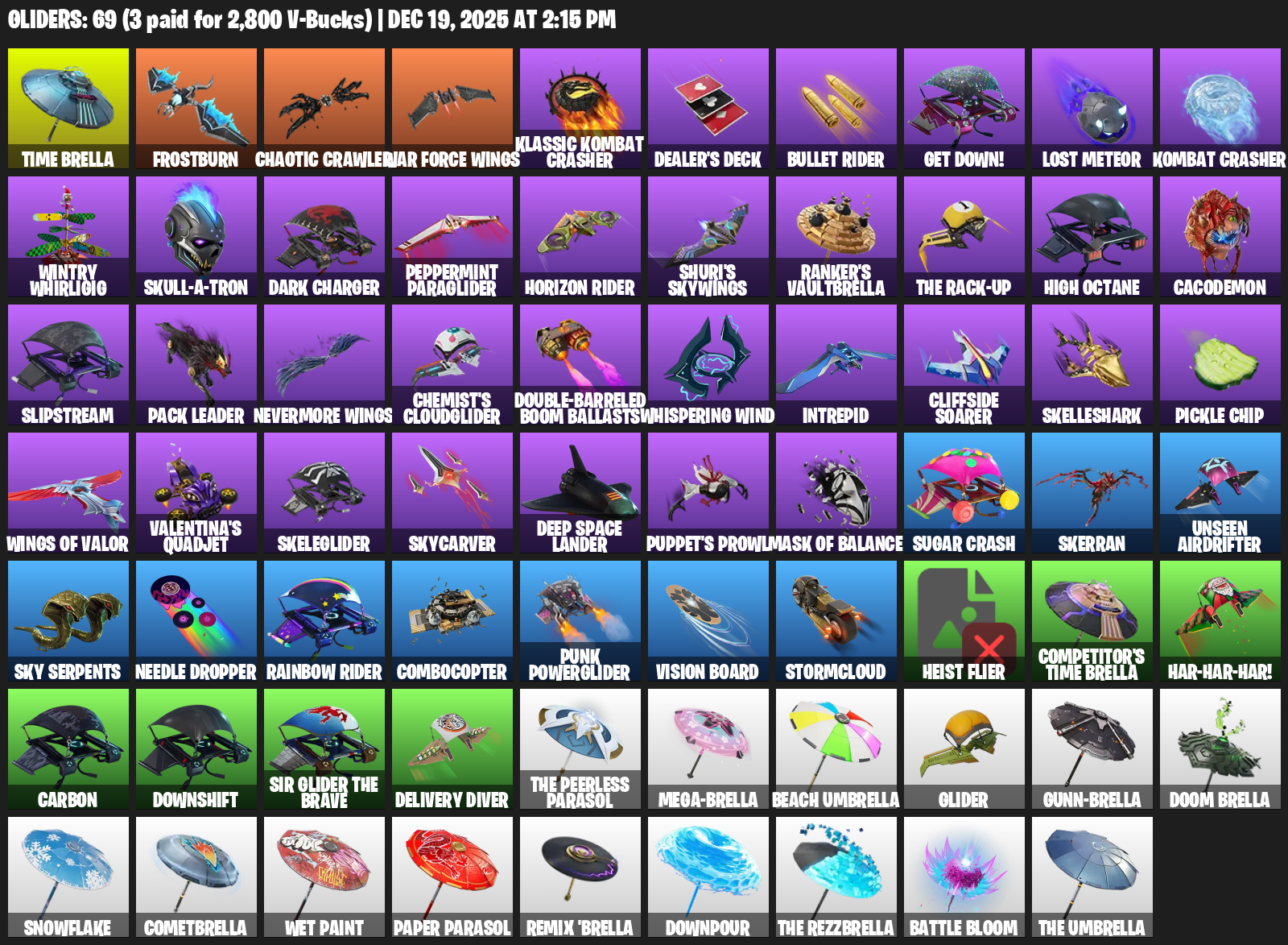 Time Brella, Frostburn, Chaotic Crawler, War Force Wings, Klassic Kombat Crasher, Dealer’s Deck, Bullet Rider, Get Down!, Lost Meteor, Wintry Whirligig, Peppermint Paraglider, Shuri’s Skywings, Ranker’s Vaultbrella, High Octane, Cacodemon