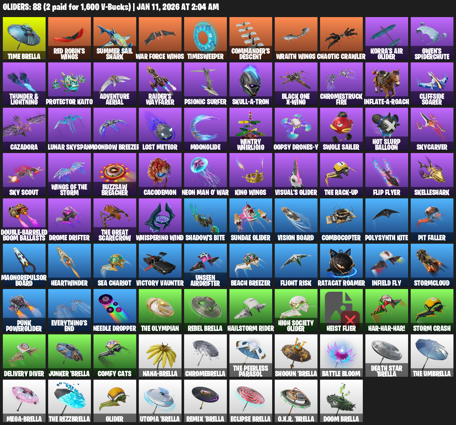 Time Brella, Red Robin’s Wings, Summer Sail Shark, Timesweeper, Commander’s Descent, Chaotic Crawler, Korra’s Air Glider, Gwen’s Spiderchute, Protector Kaito, Adventure Aerial, Raider’s Wayfarer, Psionic Surfer, Black One X-wing, Chromestruck Fire, Cliffside Soarer