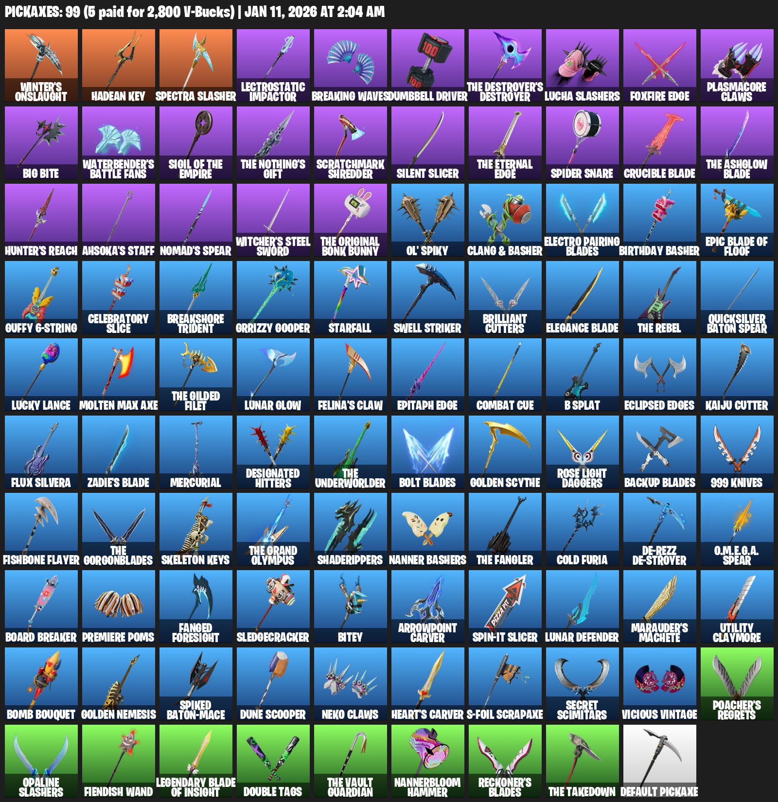 Winter’s Onslaught, Hadean Key, Lectrostatic Impactor, Breaking Waves, Dumbbell Driver, Lucha Slashers, Foxfire Edge, Plasmacore Claws, Big Bite, Waterbender’s Battle Fans, Scratchmark Shredder, Silent Slicer, Spider Snare, Crucible Blade