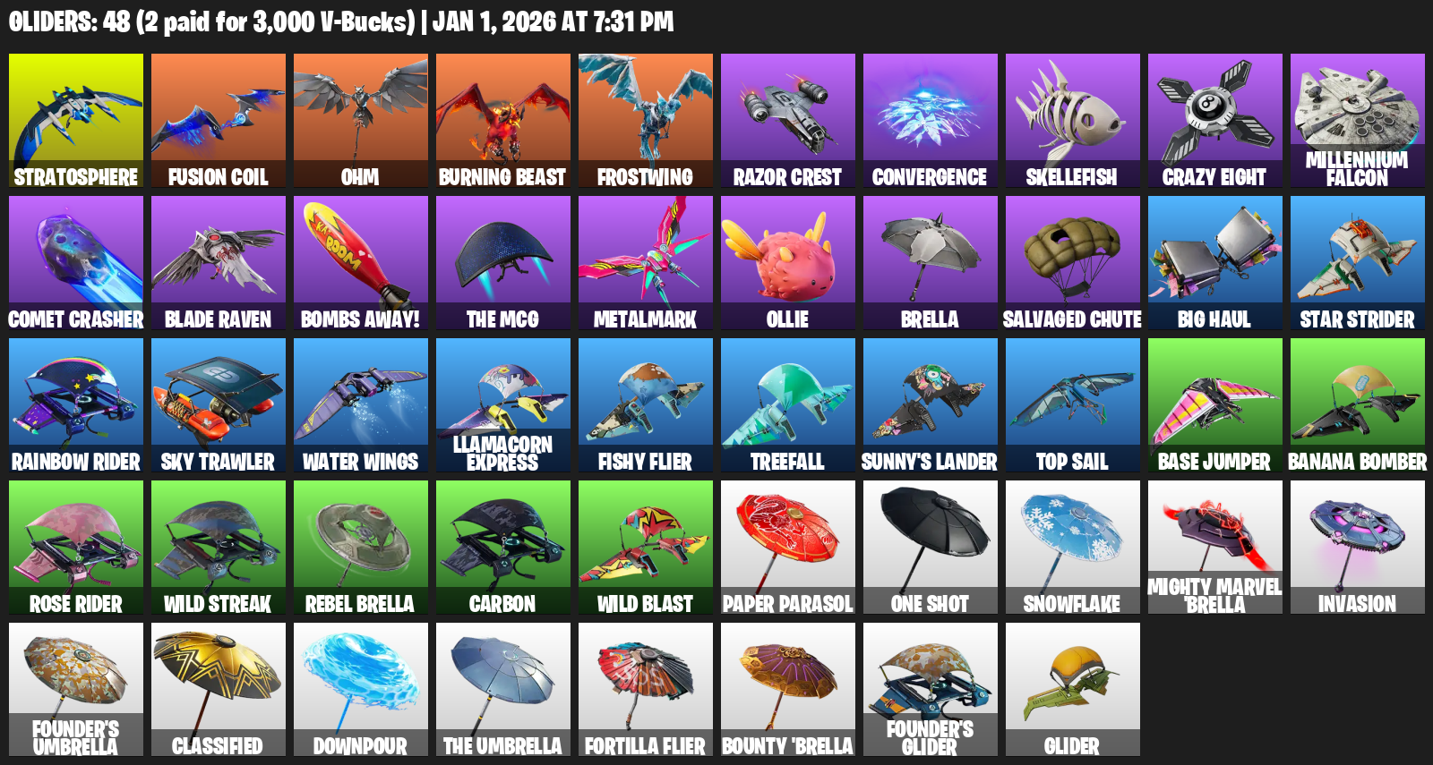 Stratosphere, Ohm, Burning Beast, Frostwing, Razor Crest, Convergence, Skellefish, Crazy Eight, Millennium Falcon, Comet Crasher, Blade Raven, Bombs Away!, Metalmark, Ollie, Brella, Salvaged Chute, Big Haul, Star Strider