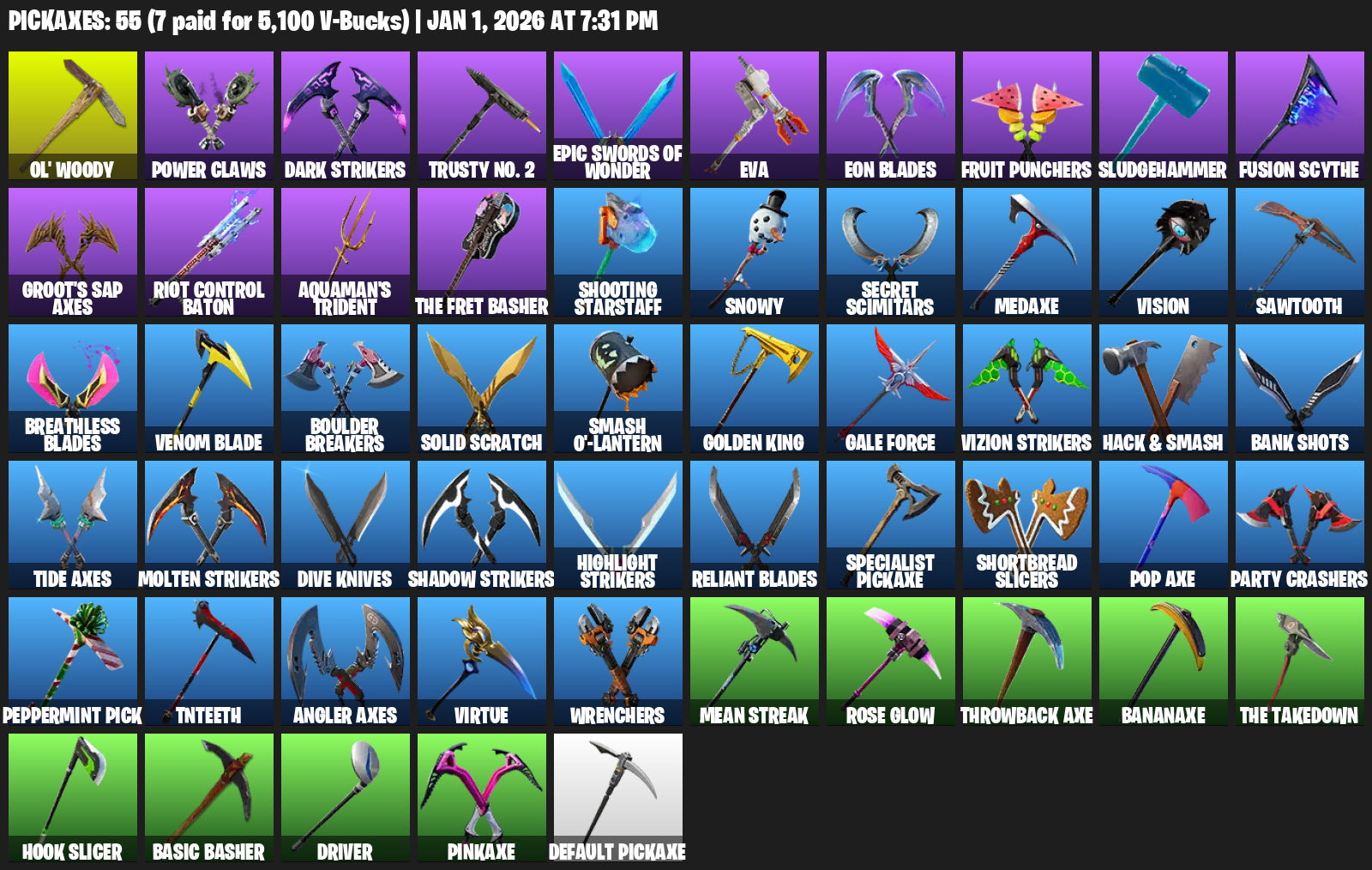 Ol’ Woody, Power Claws, Trusty No. 2, EVA, Eon Blades, Fruit Punchers, Sludgehammer, Groot’s Sap Axes, Riot Control Baton, Aquaman’s Trident, The Fret Basher, Shooting Starstaff, Snowy, Secret Scimitars, Medaxe, Vision, Sawtooth